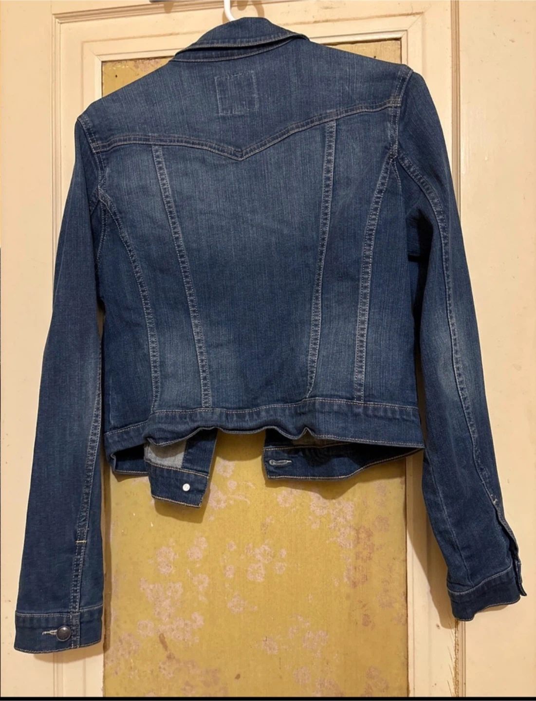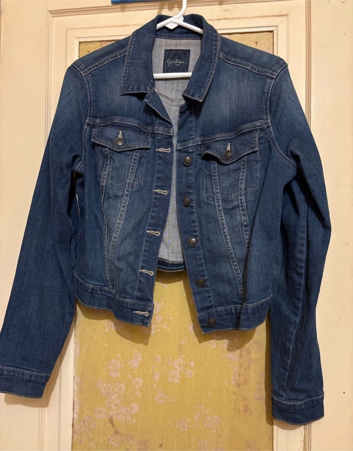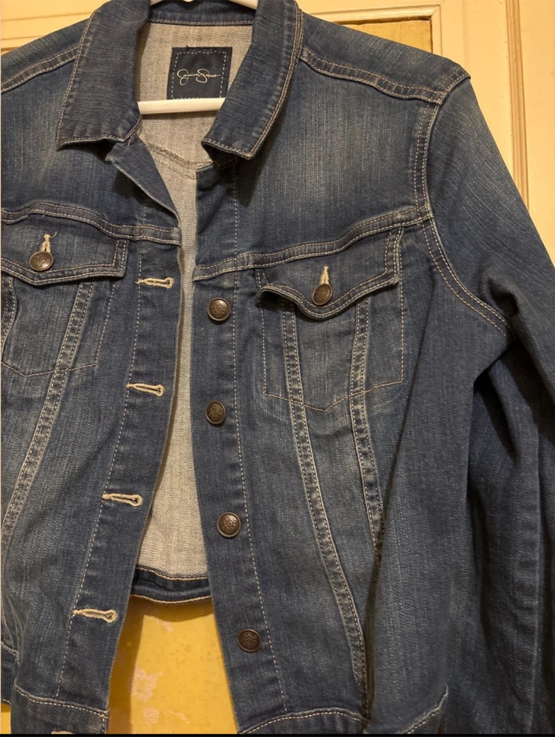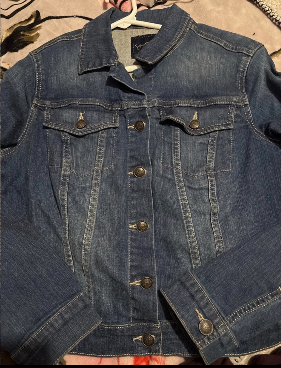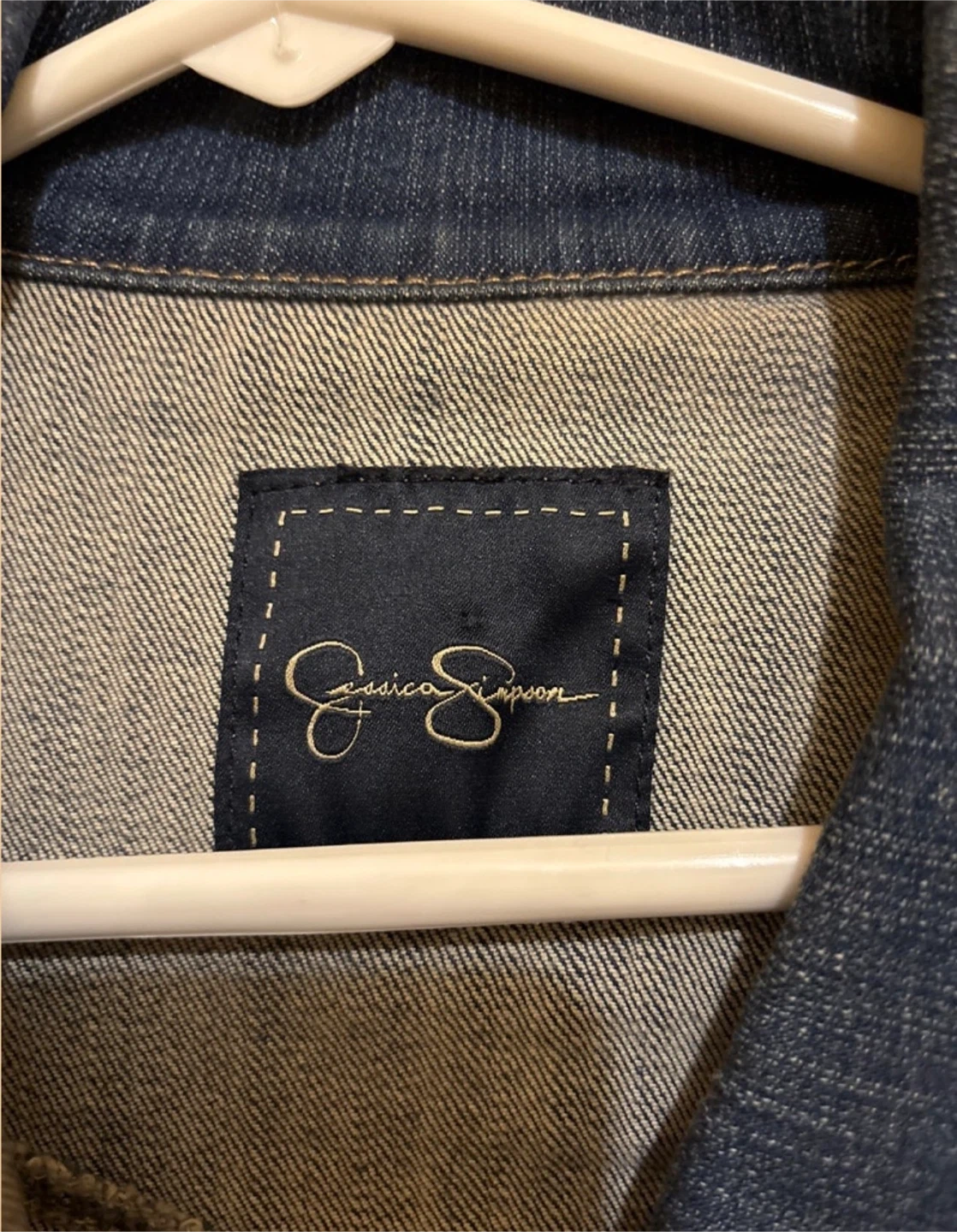 I'm selling a Jessica Simpson denim jacket in size large fit like a small/ medium crafted from 99% cotton and 1% spandex for a comfortable fit. This jacket is in good condition, ready to add a stylish touch to any outfit.