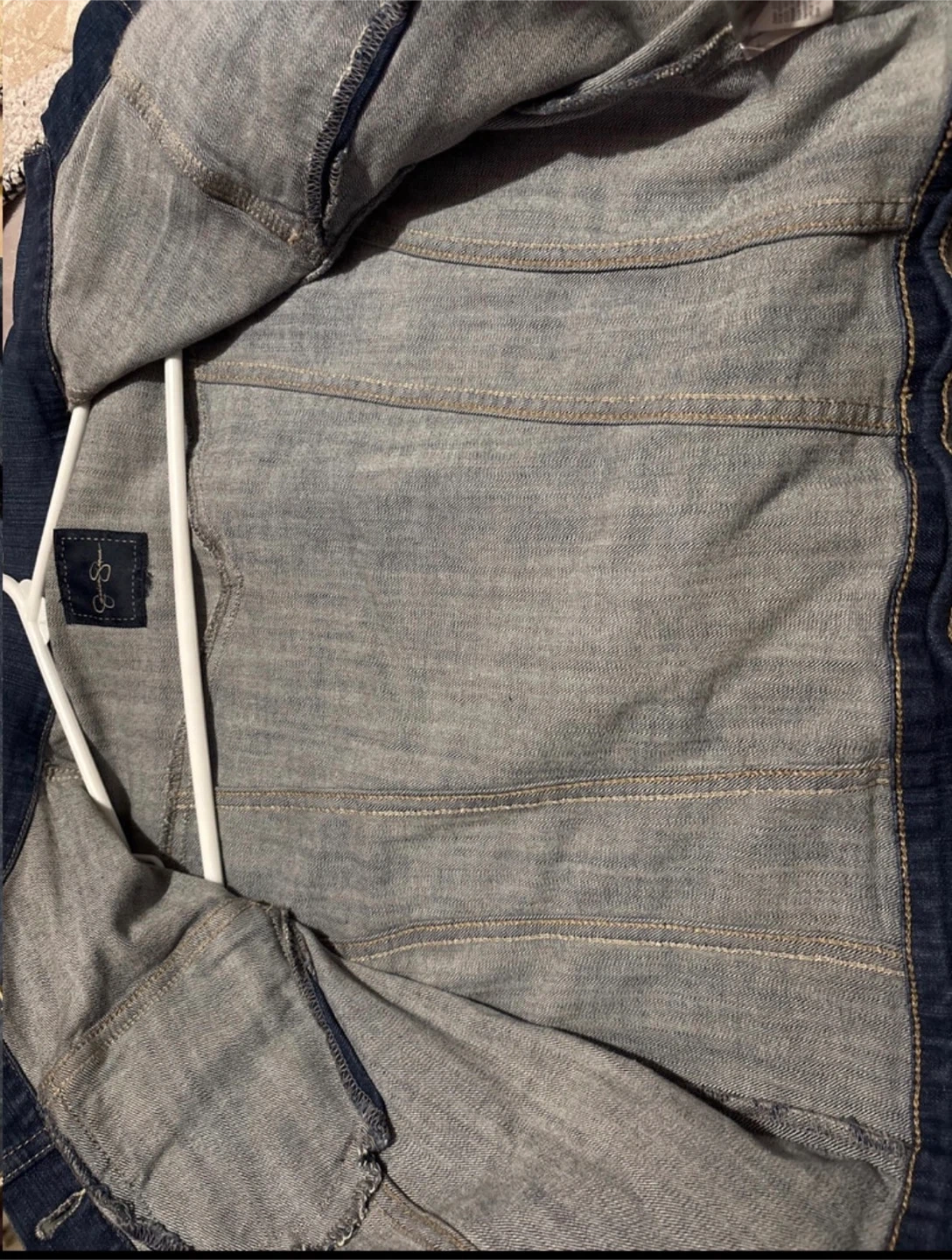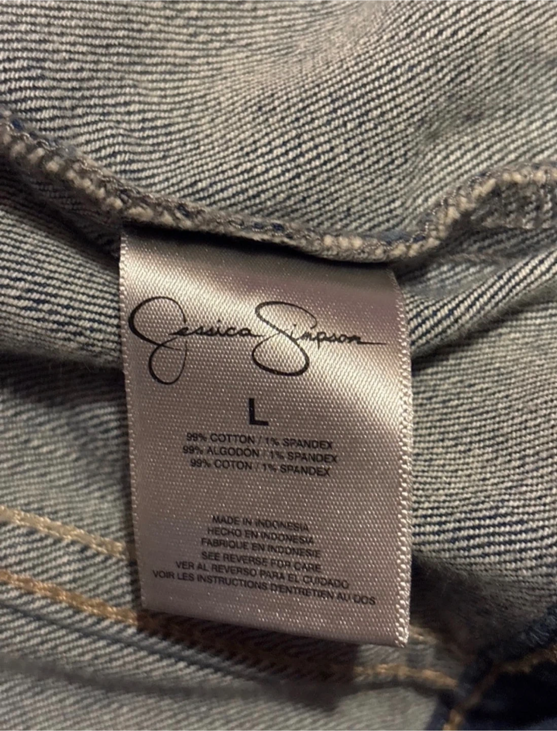 I'm selling a Jessica Simpson denim jacket in size large fit like a small/ medium crafted from 99% cotton and 1% spandex for a comfortable fit. This jacket is in good condition, ready to add a stylish touch to any outfit.