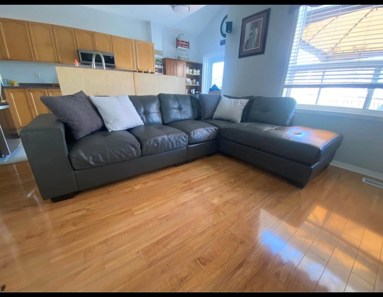 Dark colored leather sectional. Large sofa. L-Shaped grey sofa. 9βx7β. Comes apart 4 different sections.