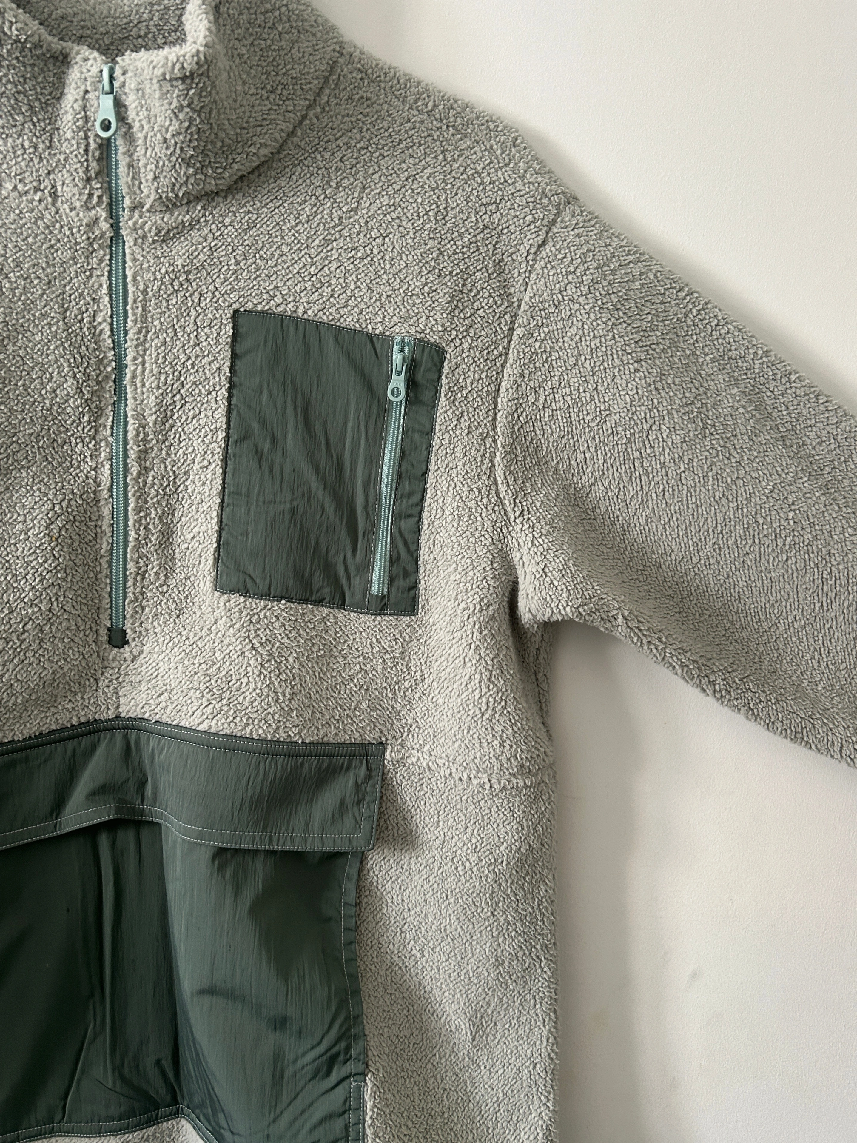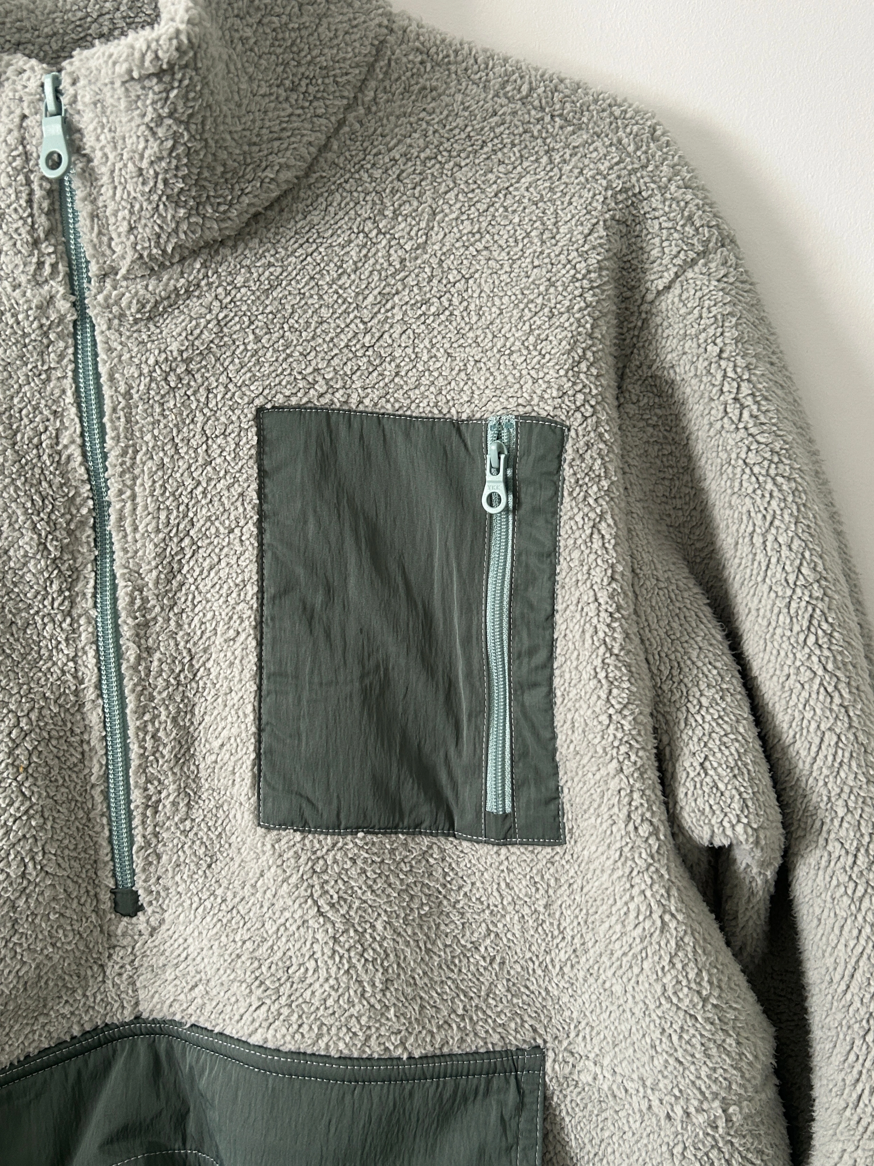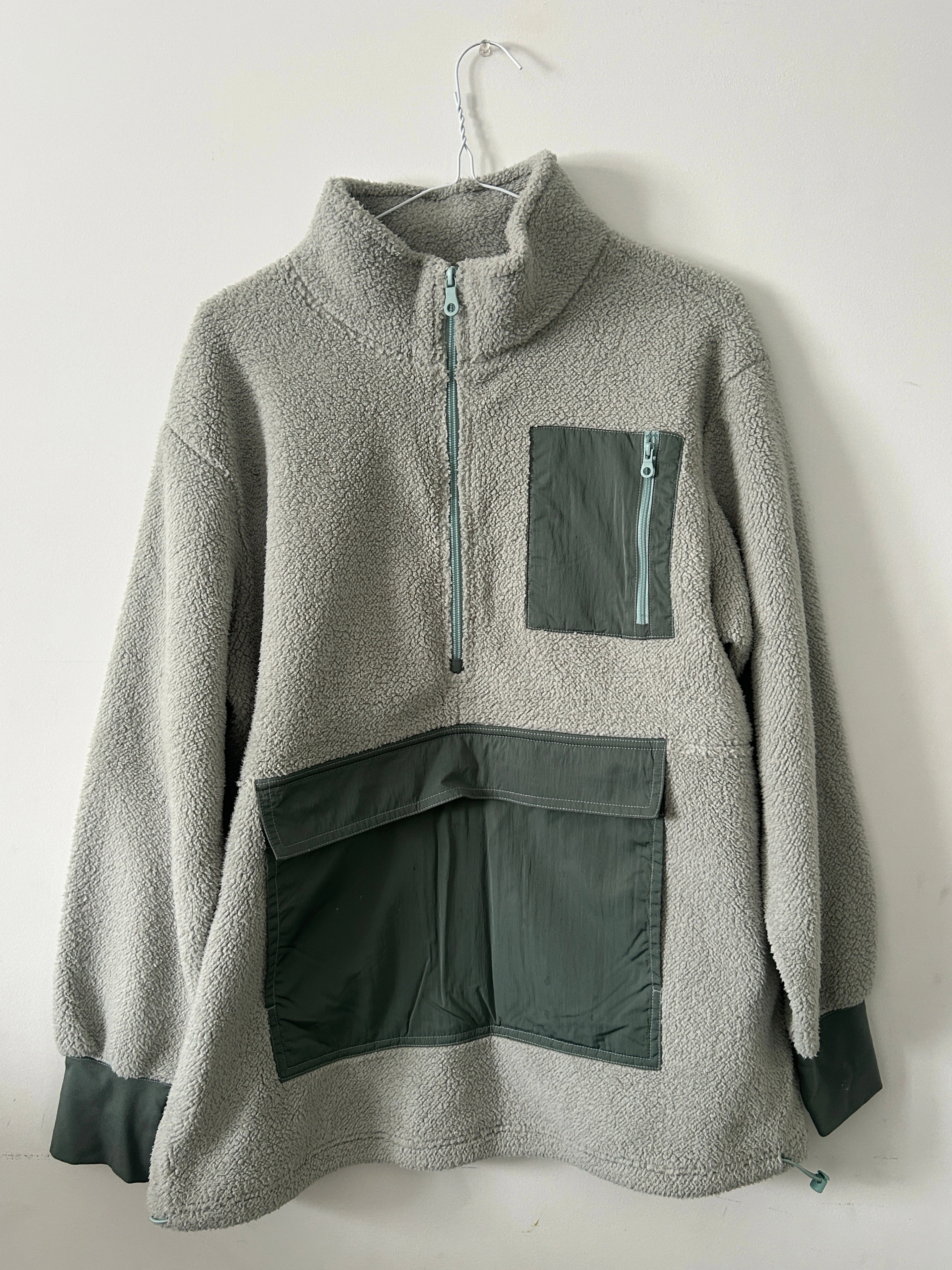 Plush, soft sherpa material all around with storm cuff thumb holes (shown in second picture). Quarter zipper to show off inside layers. Zip pocket on the front left side as shown, as well as hidden kangaroo pouch pocket. Both with what feels like water repellent material. Also has adjustable snitch waist band to make into a more cropped fit if preferred (shown in second picture). This fits like an oversized pullover and is not meant to be fitted. Great to put on for a easy morning walk and warm enough to have with layers in the fall and winter.