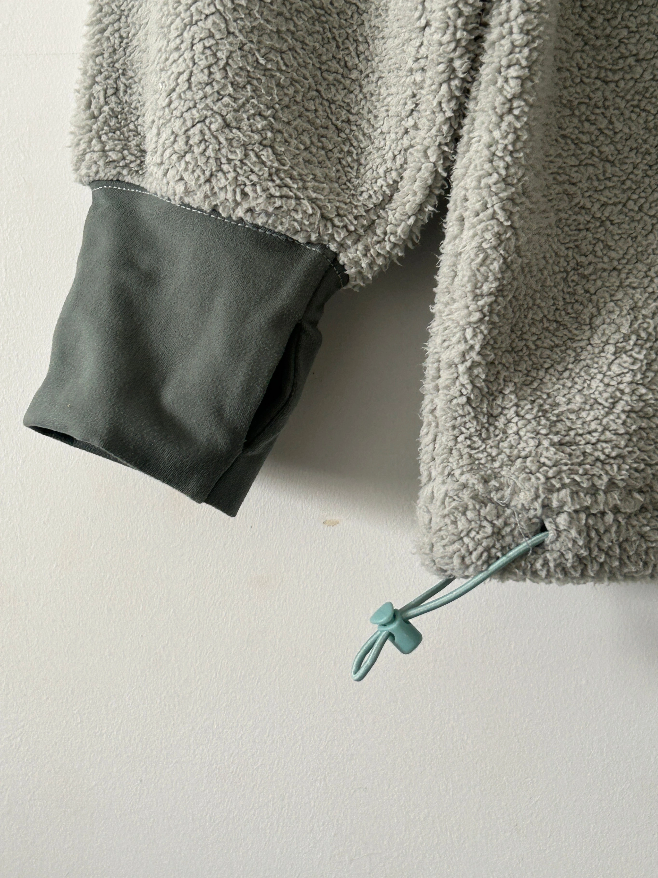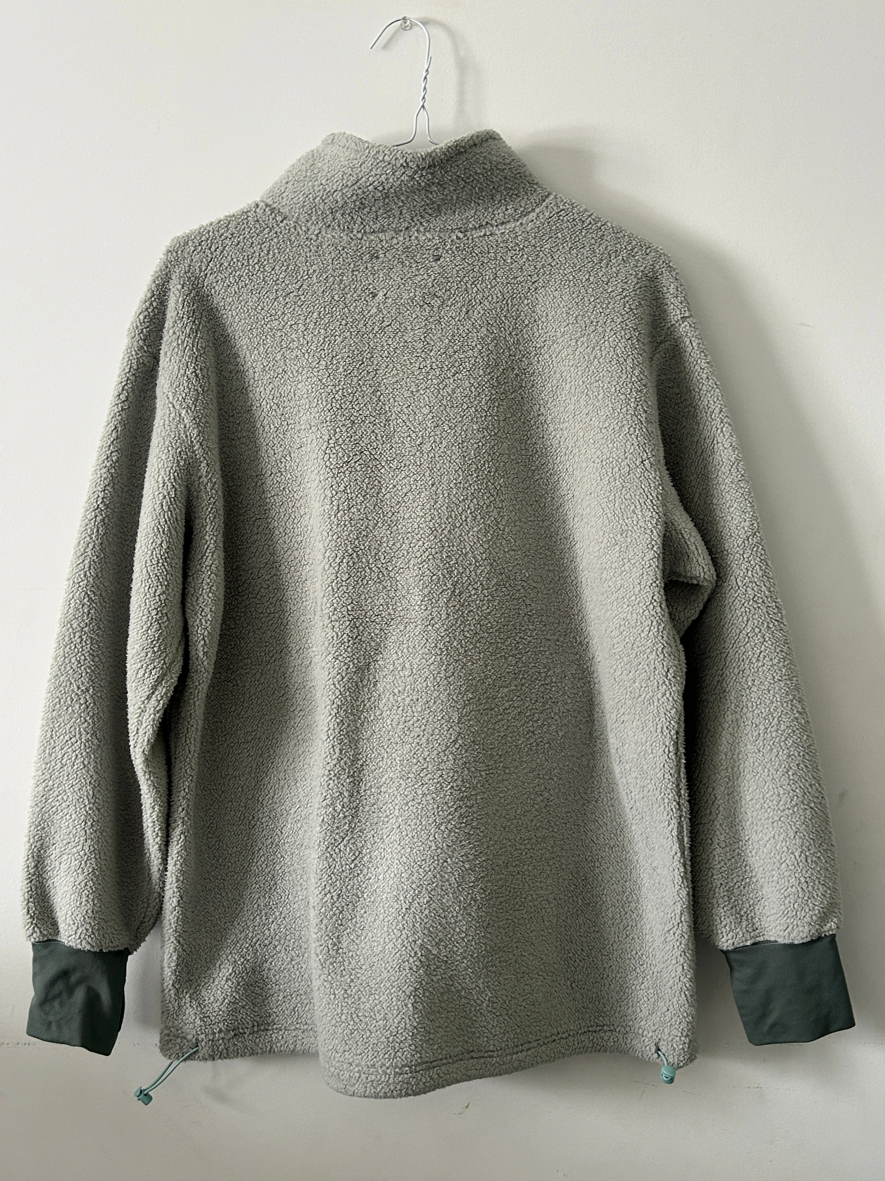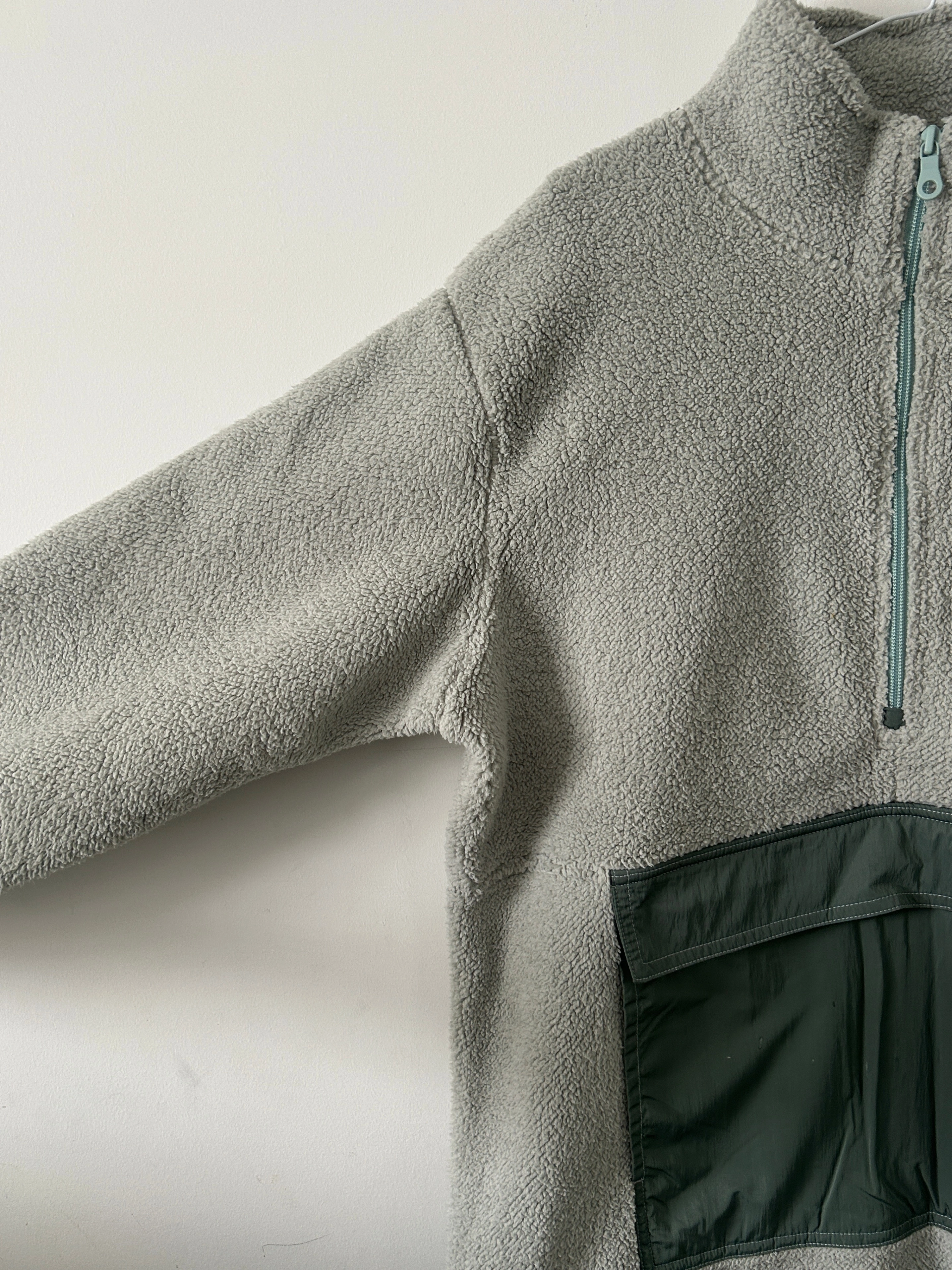 Plush, soft sherpa material all around with storm cuff thumb holes (shown in second picture). Quarter zipper to show off inside layers. Zip pocket on the front left side as shown, as well as hidden kangaroo pouch pocket. Both with what feels like water repellent material. Also has adjustable snitch waist band to make into a more cropped fit if preferred (shown in second picture). This fits like an oversized pullover and is not meant to be fitted. Great to put on for a easy morning walk and warm enough to have with layers in the fall and winter.