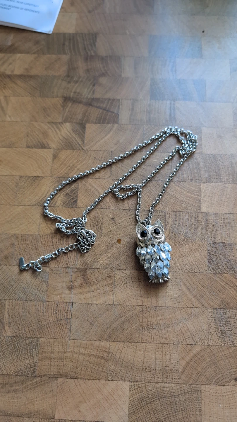 This necklace features a silver-tone chain and a pendant shaped like an owl. The owl is adorned with clear rhinestones and black eyes. It's a charming accessory!