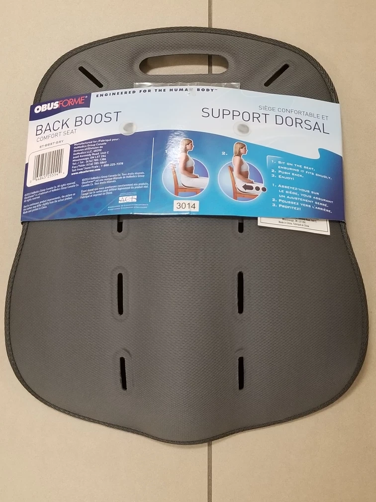 This is a back support seat designed for improved posture and back pain relief. OBUS FORME SUPPORT DORSAL BACK BOOST SUPPORT.Gift idea Brand New Packed. Comes from a pet and smoke free clean environment please call/ text for faster reply 647 855 6217 FEATURES : Light weight, Portable Engineered for human body bottom and back support. ObusForme Back Dorsal Support Seat Back Booster Back Booster Comfort Seat Improves Sitting Posture. To Use on soft and hard surfaces. To use for Home /Office chair & Car Seat. To use, Turn Handle to front of the seat. Contour Design Improves Posture. Non slip base layer Easy Carrying Handle. Note:  place handle at the front when in use. Seat size is approx 15" x 12" NOTE: All pictures are real raw ones taken by my old phone and never touched for any editing or alteration. All the details in ad are true and facts to the best of my knowledge to & ability. NOTE: Original price is way more+ Tax Here Price is the lowest & firm to go away. NOTE: if u like, please Click on my other ads on kijiji (Alash) like Leather Shoes, Tennis and Squash rackets, yoga Matts, Bike U locks, Helmets and more….. Mostly Brand Name Mint or in New Condition in about half price to go away. Thanks for your time.