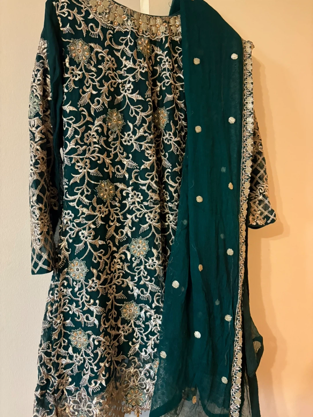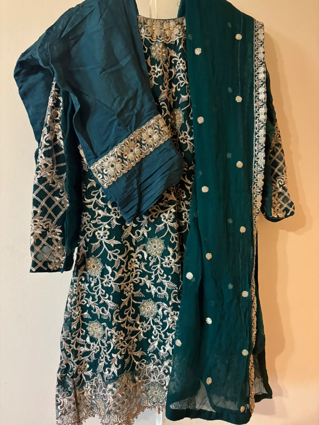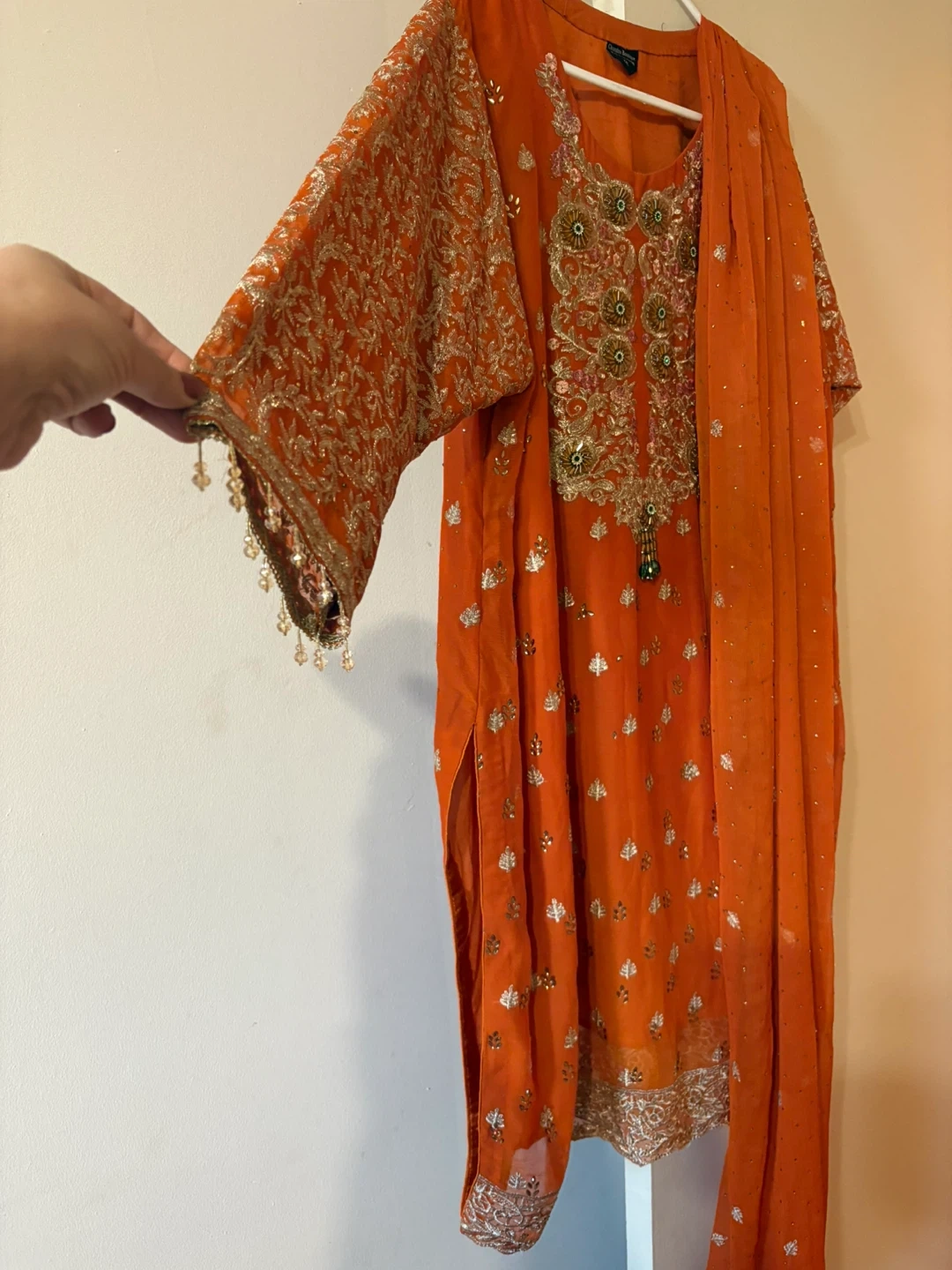 This is a beautiful orange kurti with intricate embroidery and a matching dupatta. It features detailed silver and gold threadwork throughout the garment. The set also includes coordinating pants.