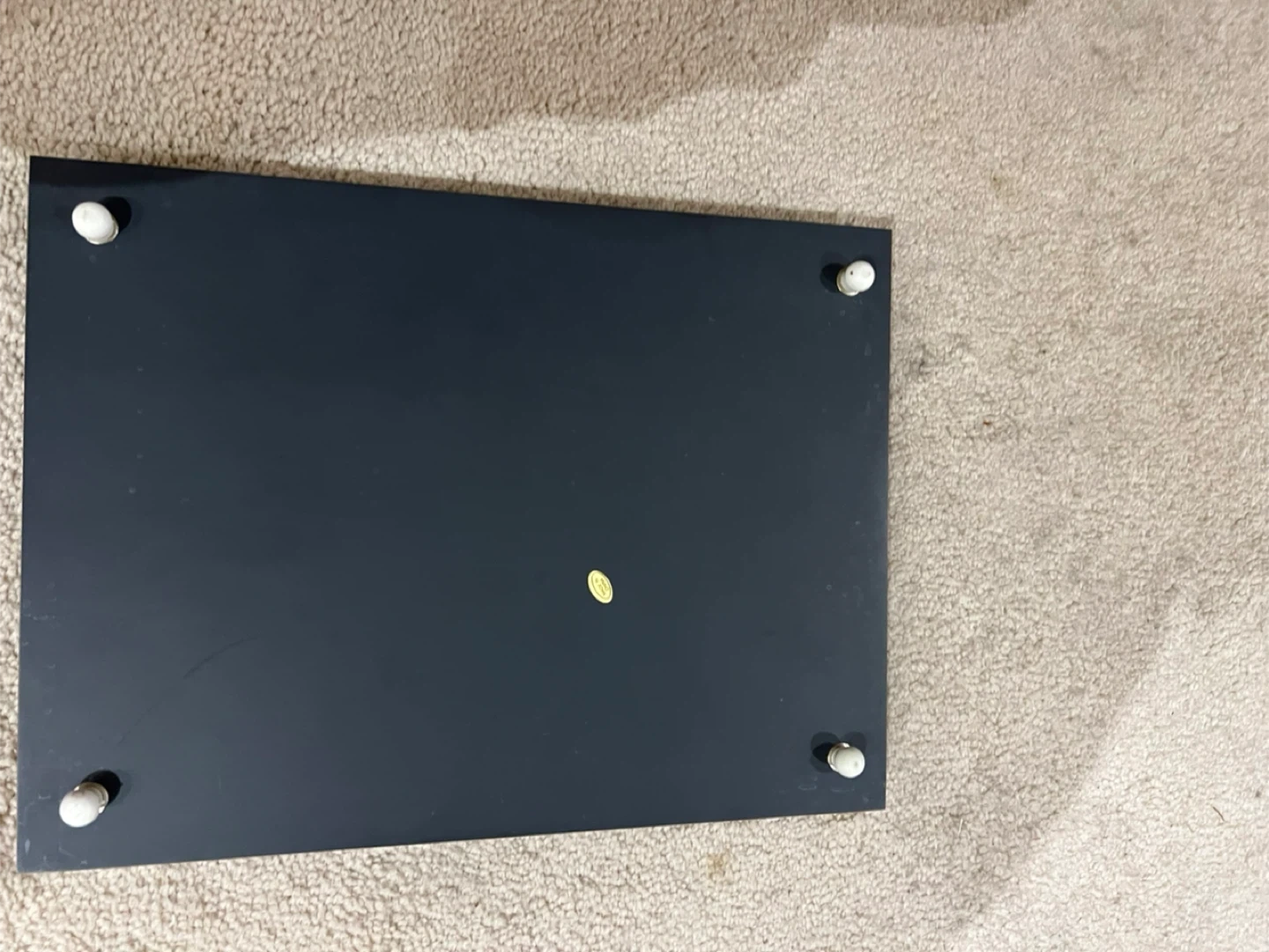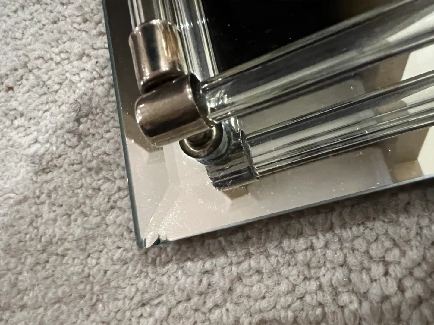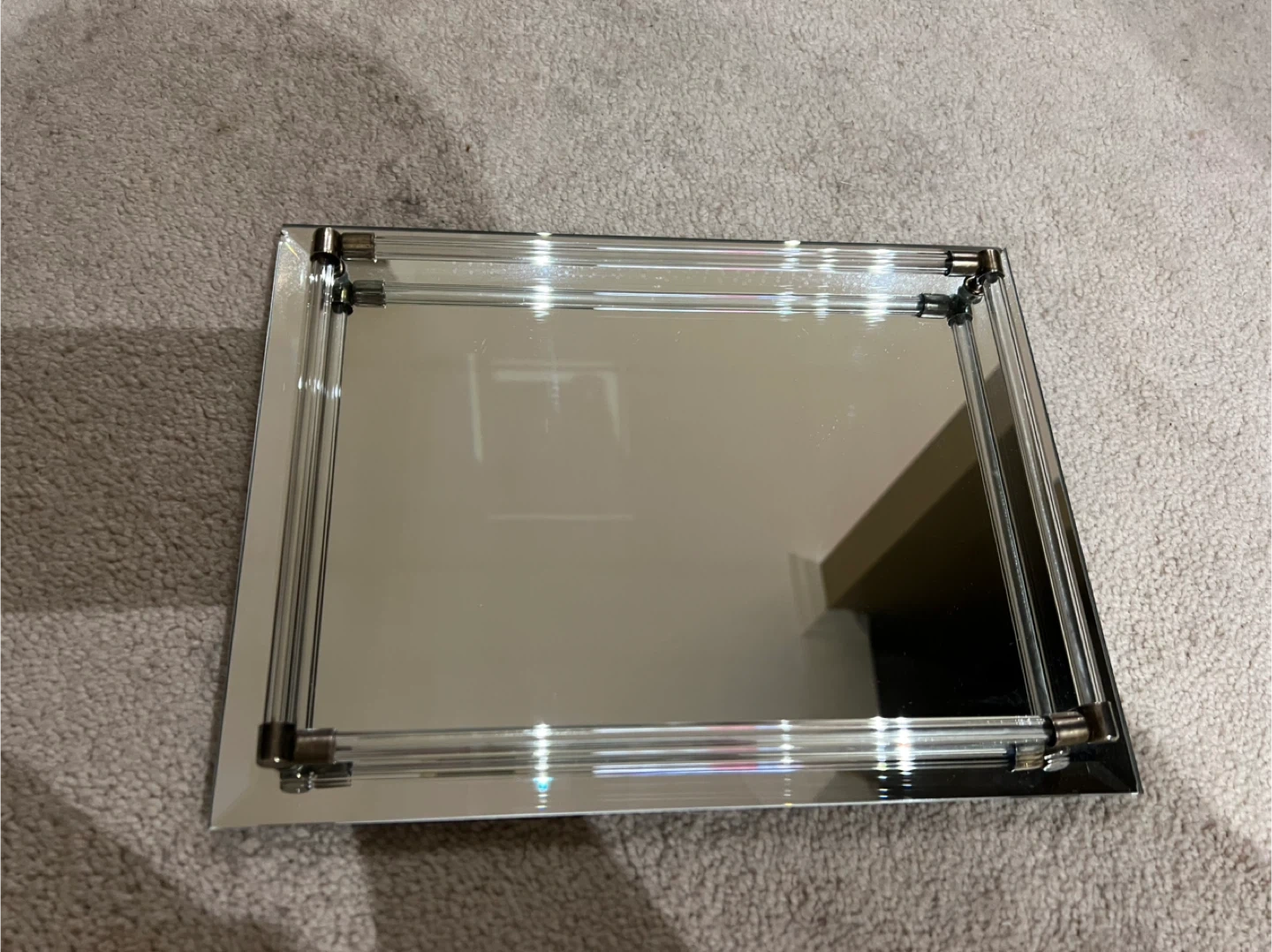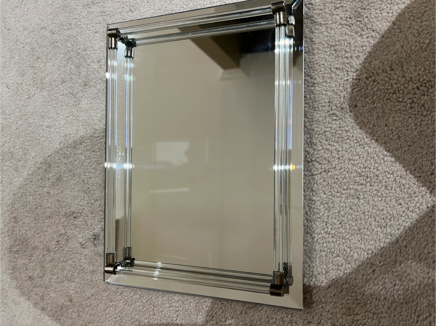 This decorative mirror features a beveled edge and a stylish frame with clear acrylic rods and silver-toned accents. It's a great addition for entryways or dressing tables. Mirror surface is clean, but there's a small chip on one corner of the glass.