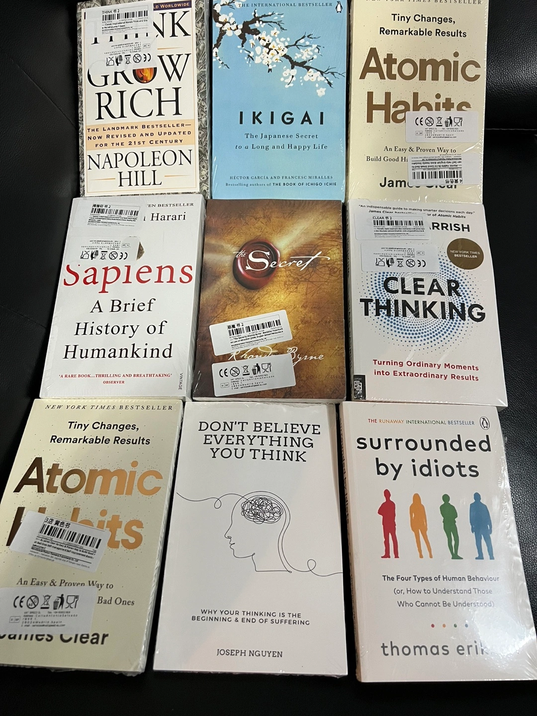 Collection of popular books. Includes titles on personal development, habits, thinking, and history. Good condition. Various authors.