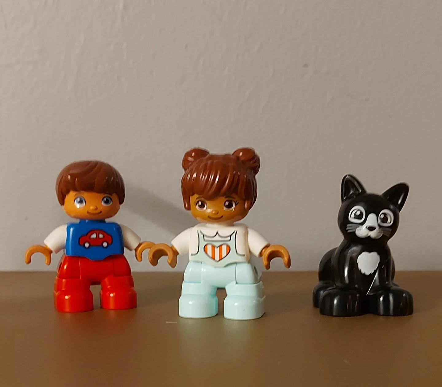 Set of three LEGO DUPLO figures, including two children and a black cat. The boy figure wears a red shirt with a car. The girl figure wears light blue overalls. Made of plastic.