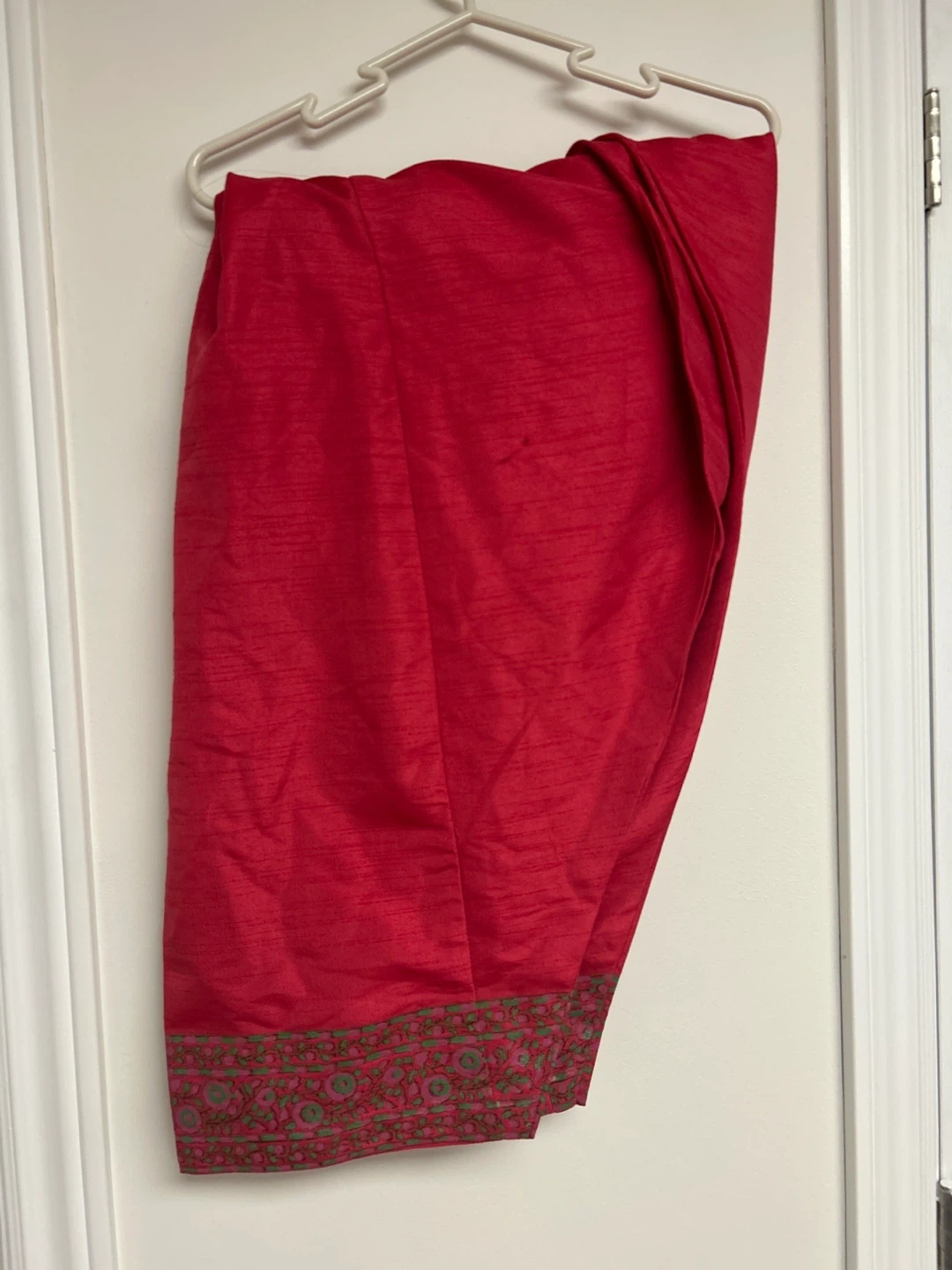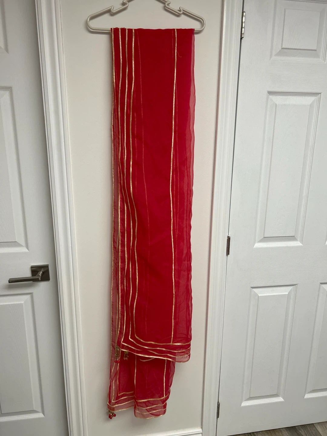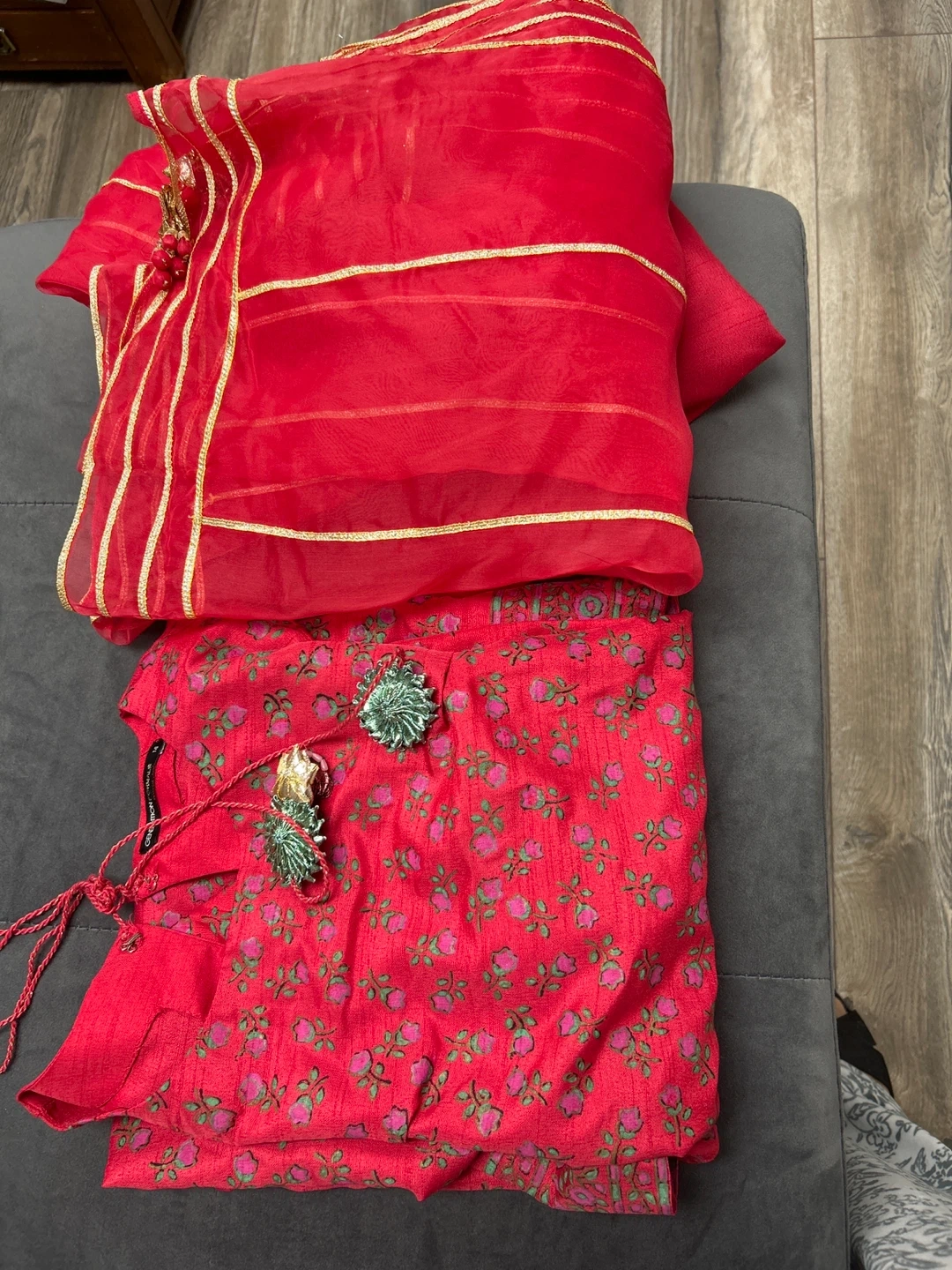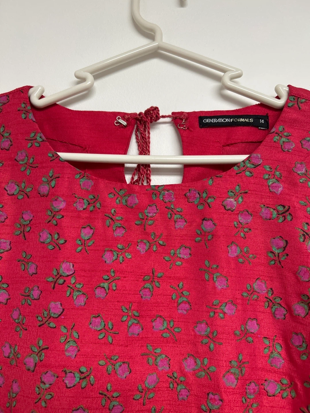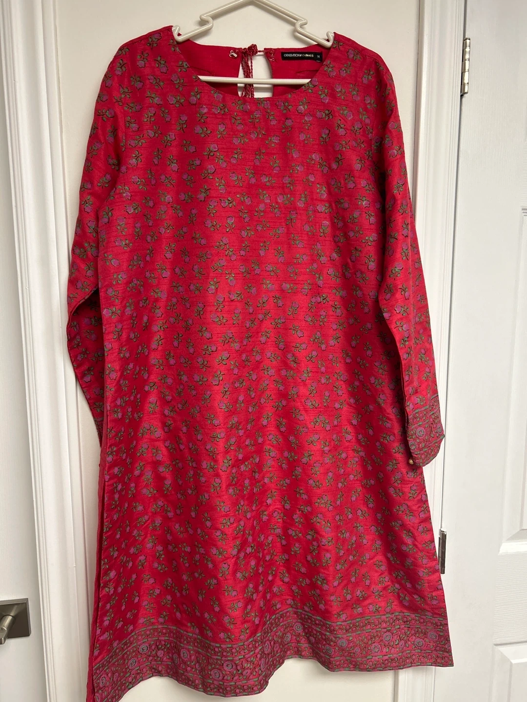 This Generation Formals set features a vibrant red kurta with a floral print and matching red pants. The kurta has long sleeves and a detailed border at the hem. A coordinating red dupatta with gold trim is also included. It's a size 14. This outfit would be lovely for a family gathering or cultural event!