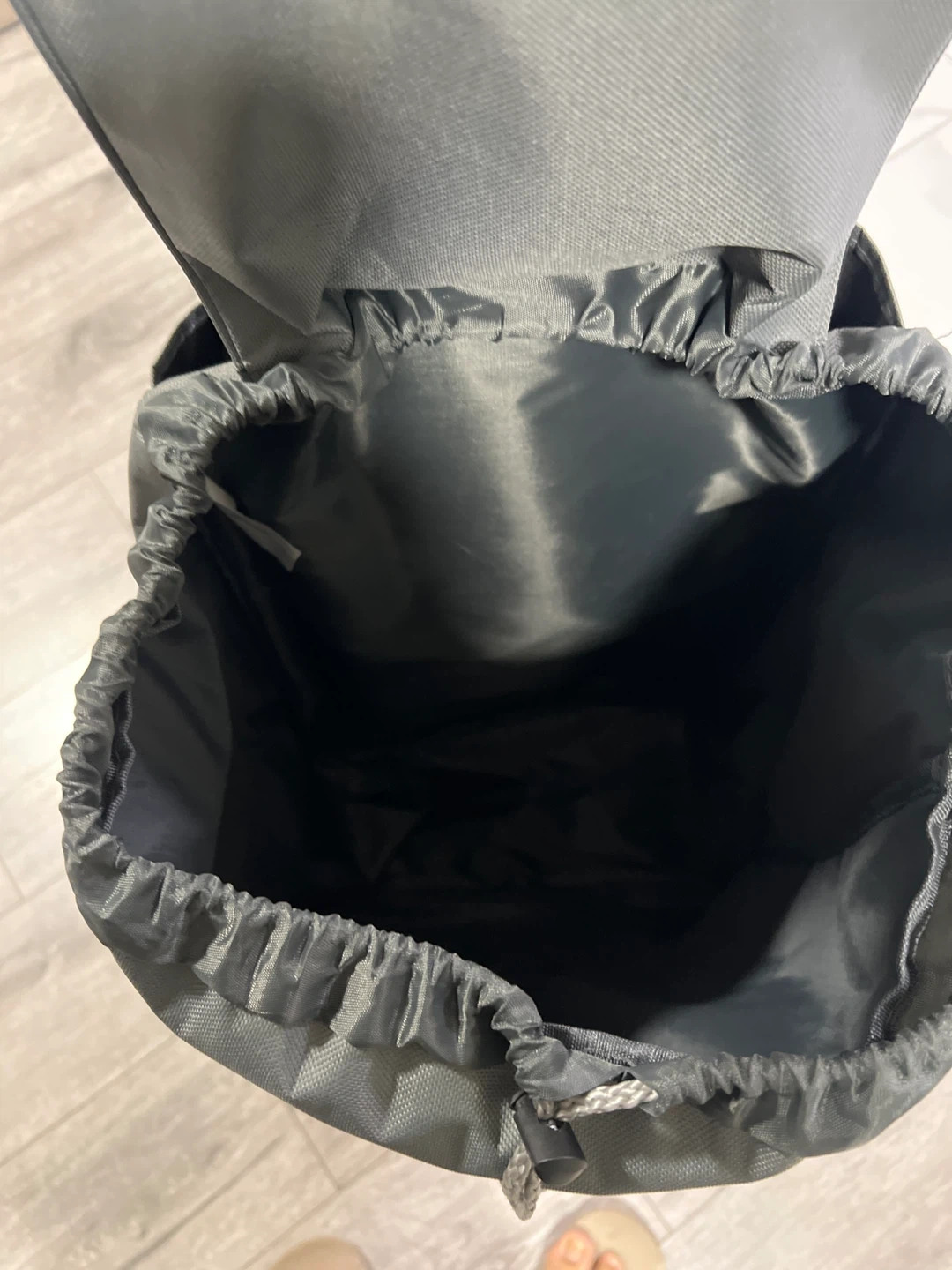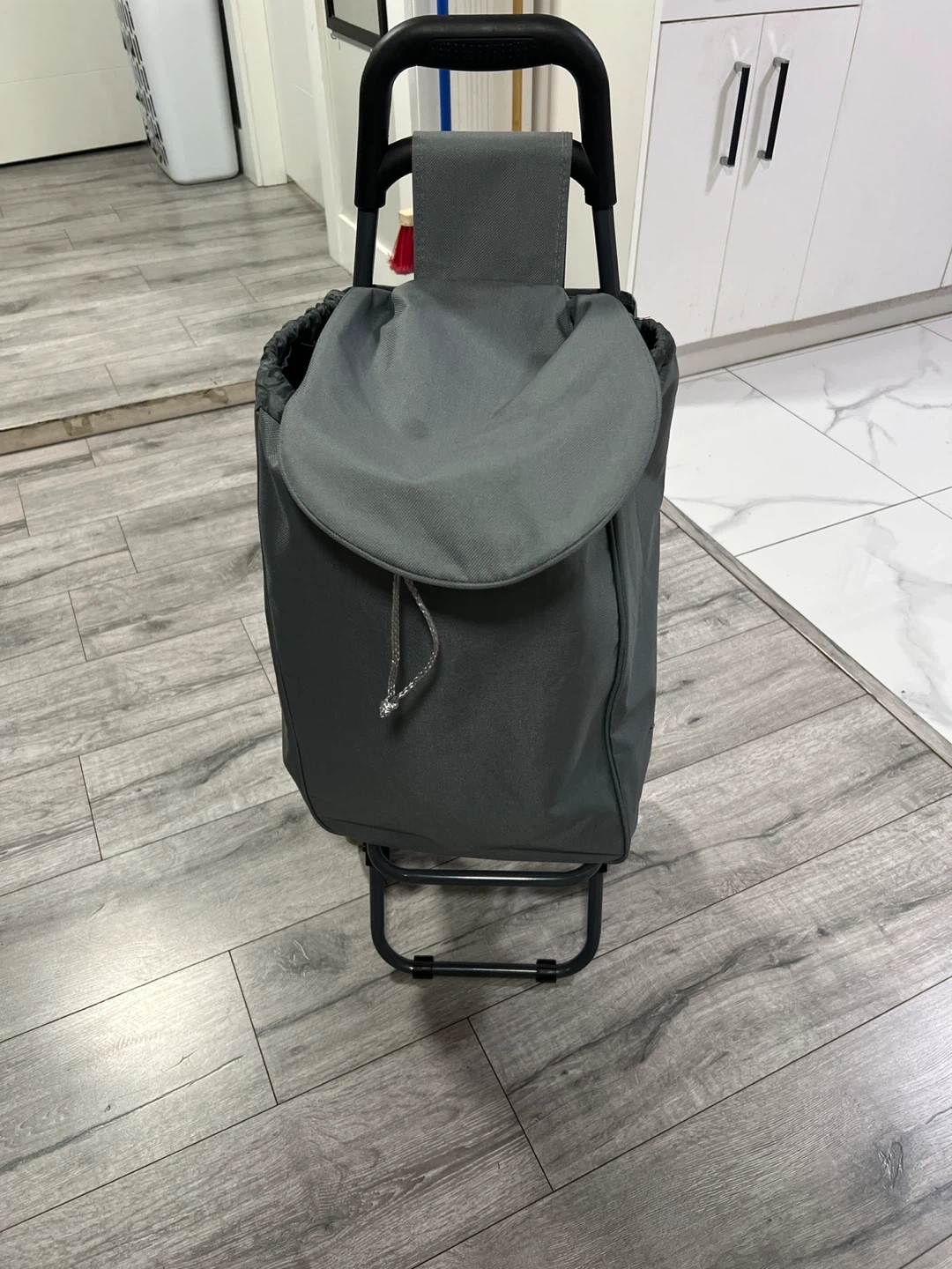 This is a grey shopping trolley bag with a drawstring closure and two wheels. It's made of fabric and has a metal frame for support. Perfect for carrying groceries or other items when you're out and about!