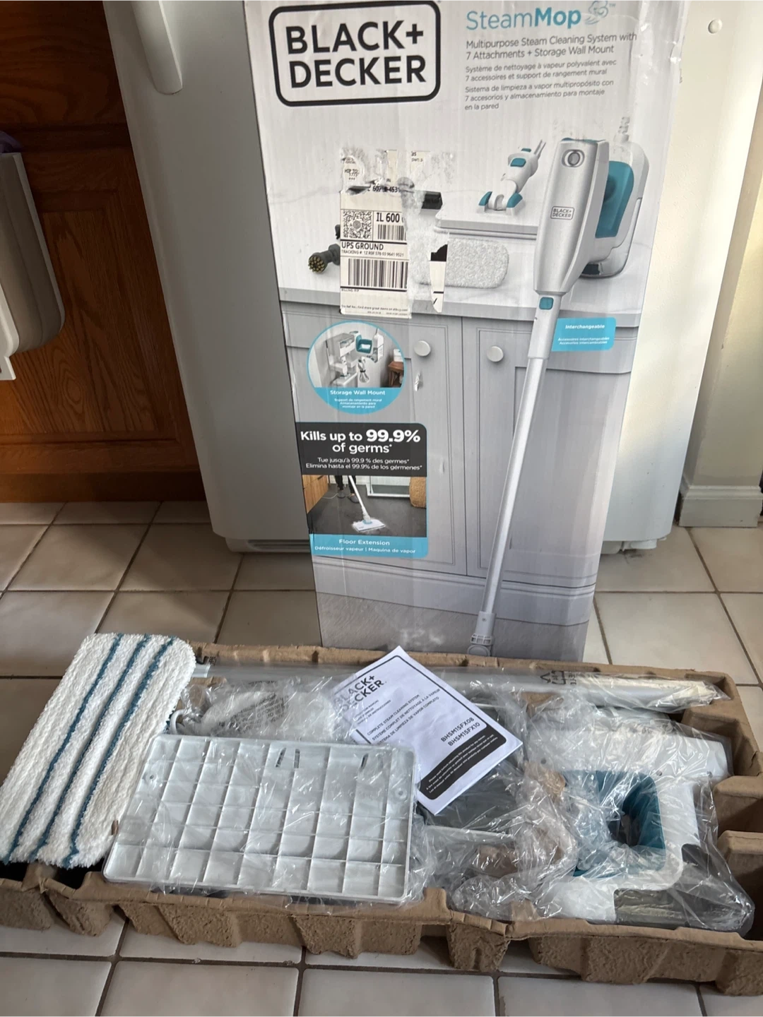 Selling a brand new BLACK+DECKER SteamMop! This is a multipurpose steam cleaning system that comes with attachments and a storage wall mount. It kills up to 99.9% of germs. Includes floor extension.