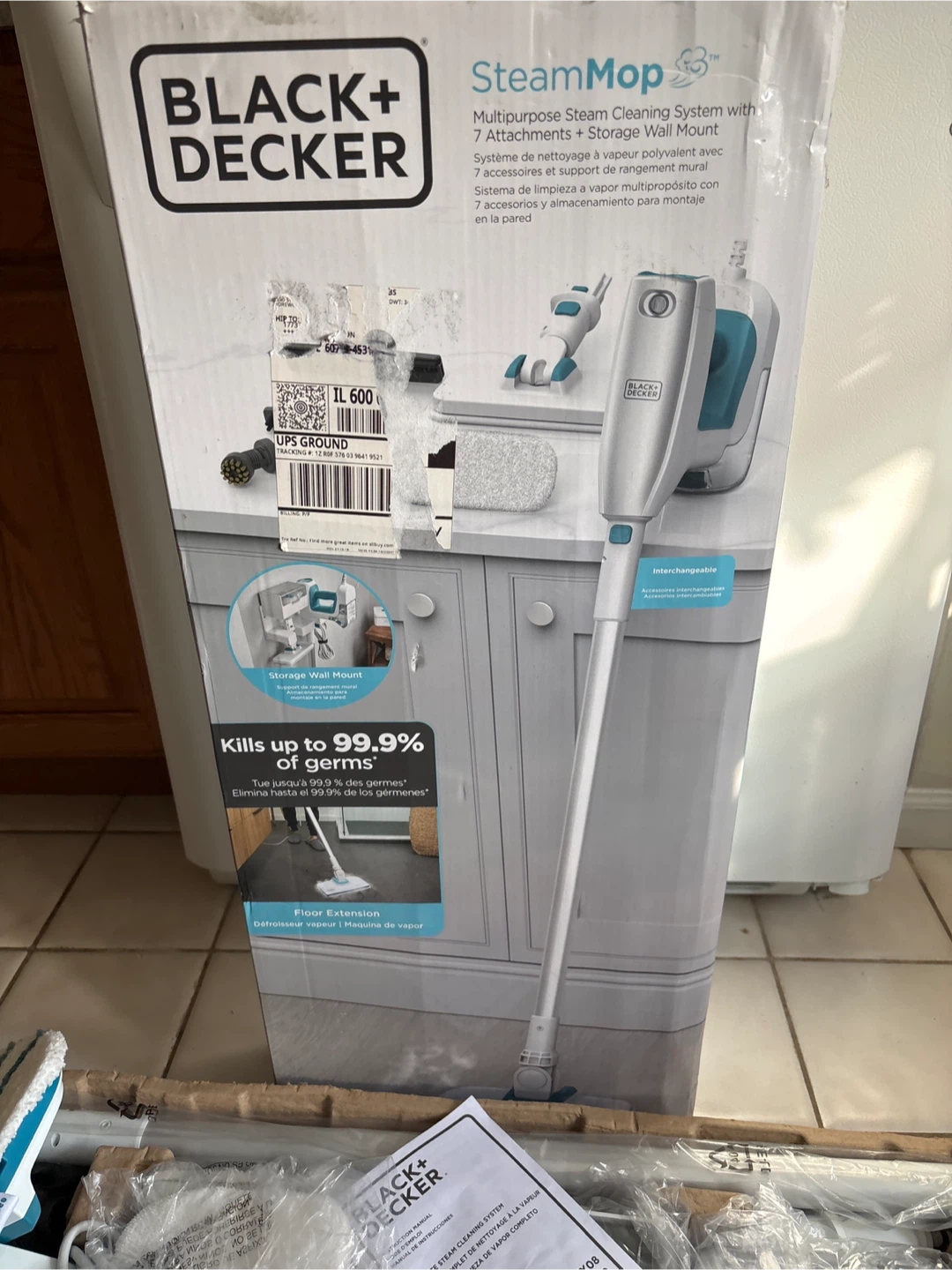 Selling a brand new BLACK+DECKER SteamMop! This is a multipurpose steam cleaning system that comes with attachments and a storage wall mount. It kills up to 99.9% of germs. Includes floor extension.