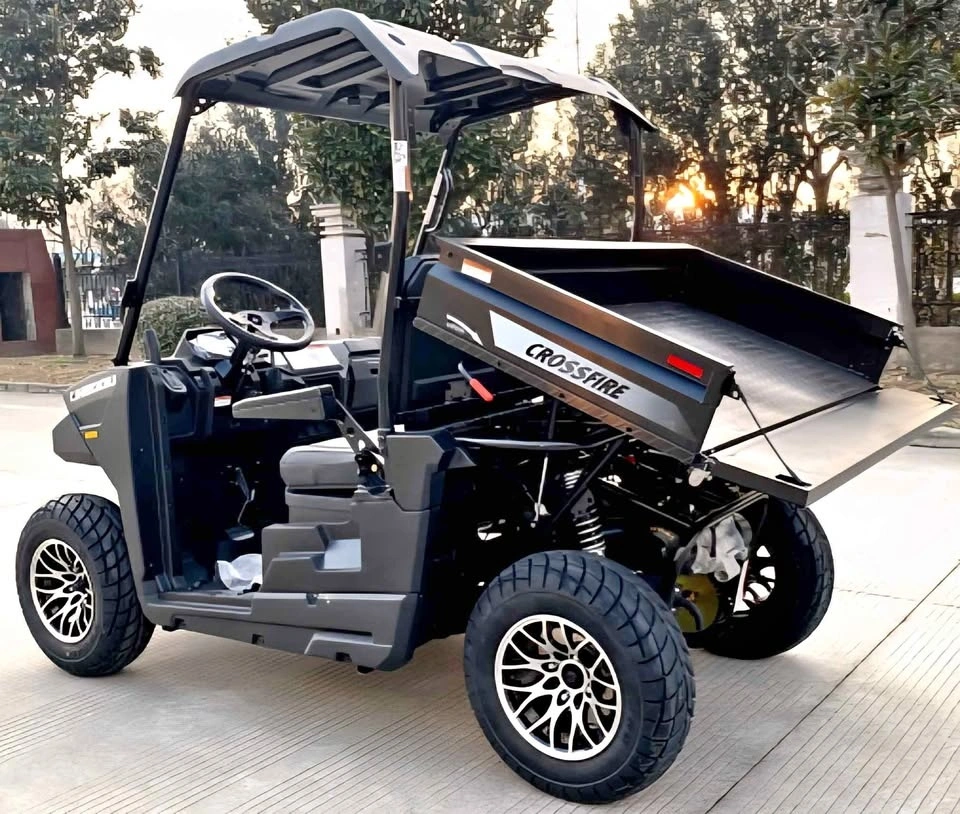 The Crossfire 200 EFI Dump Bed UTV is a rugged and reliable utility vehicle designed for work and adventure. Powered by a 177.3cc EFI engine with CVT automatic transmission, it delivers smooth performance and efficiency. The durable cargo bed supports up to 441 lbs, making it ideal for hauling gear, tools, or supplies. With four-wheel disc brakes, dual A-arm front suspension, and swingarm dual shocks.