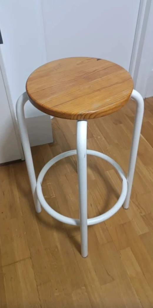This bar stool features a natural wood seat with a white metal frame. It includes a circular footrest. Good for extra seating. Has a few marks as shown in picture, otherwise it's in good condition and ready for a new home!