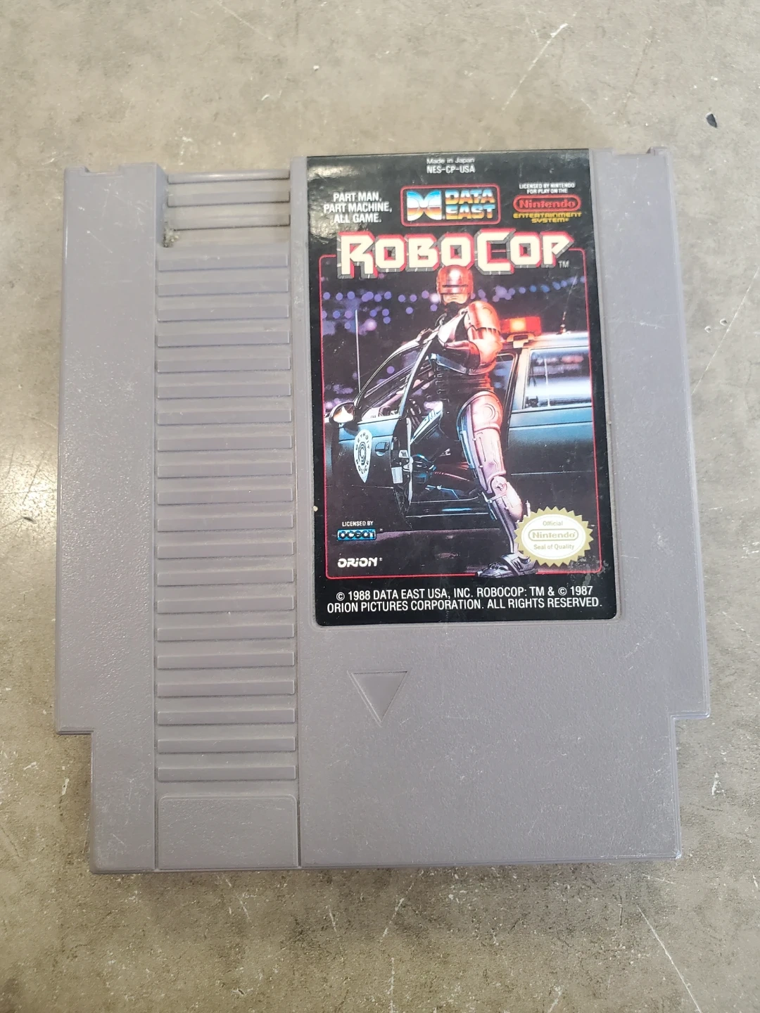 RoboCop video game cartridge for the Nintendo Entertainment System. Published by Data East USA in 1988. Compatible with NES consoles.