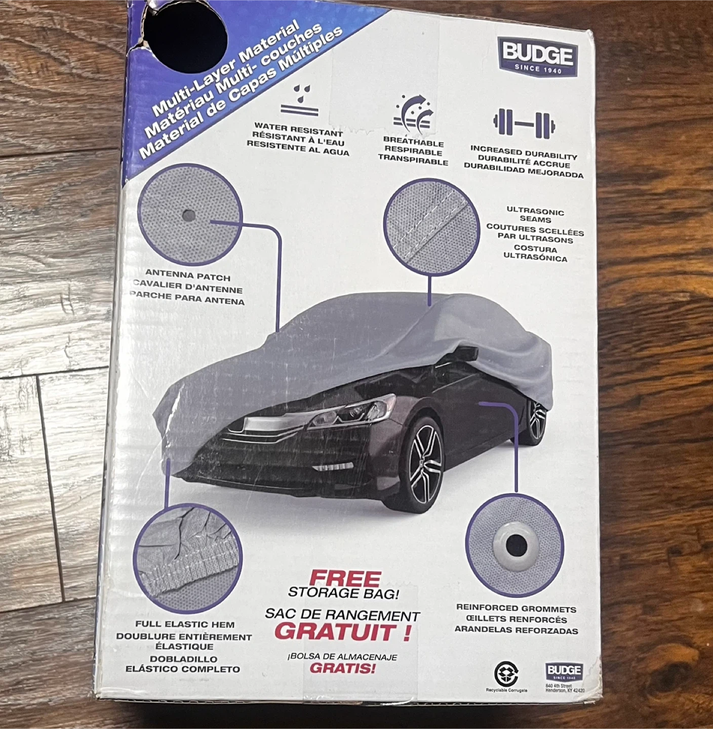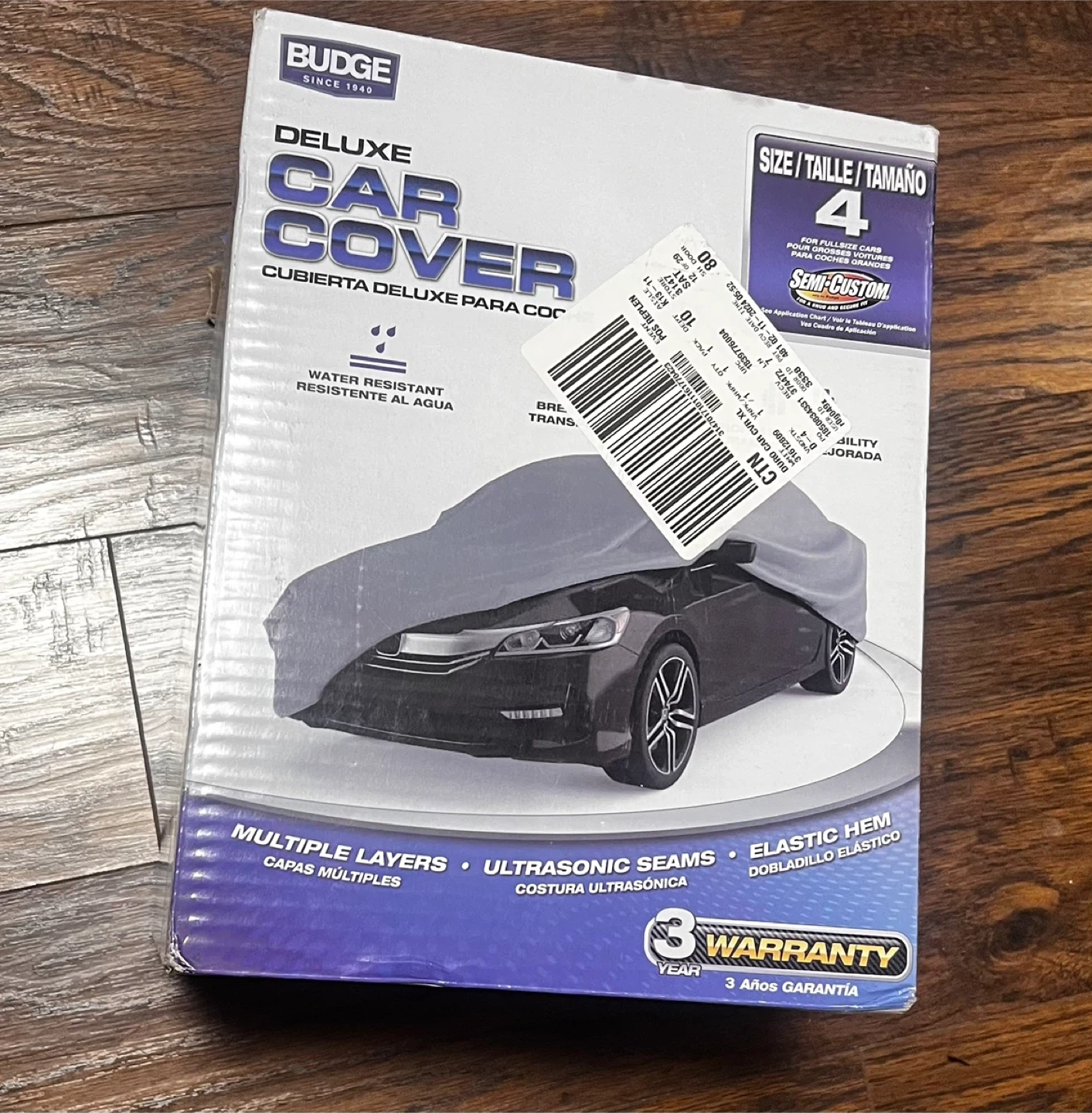 Selling a Budge Deluxe Car Cover, size 4! This cover is designed to protect your car with multiple layers and ultrasonic seams. It's water-resistant and breathable, ensuring increased durability. The cover also features a full elastic hem and reinforced grommets, plus it comes with a free storage bag. It fits cars that measure 19'1" to 22' (5.8 m - 6.7 m).