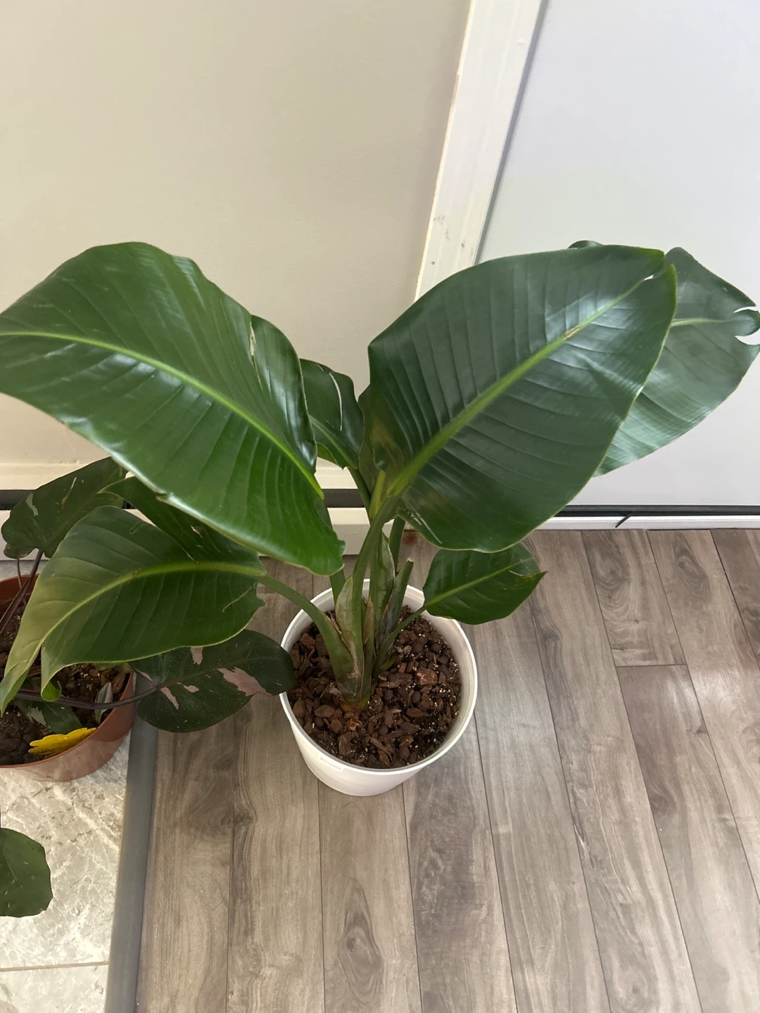 A lush Bird of Paradise plant in a white pot. It's a beautiful green houseplant with large, striking leaves. This plant is ready to add a tropical feel to your space!