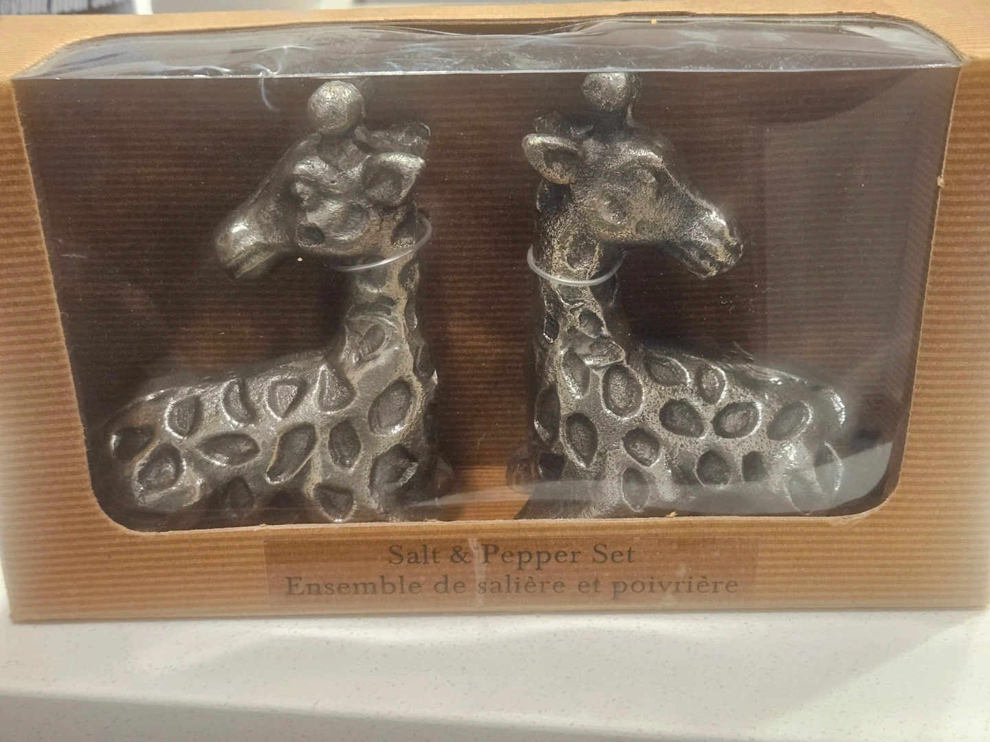 Selling a brand new giraffe salt and pepper set, still in its original packaging! This adorable set will add a touch of whimsy to your dining table or kitchen counter. Perfect for animal lovers or anyone looking for a unique and charming addition to their home decor