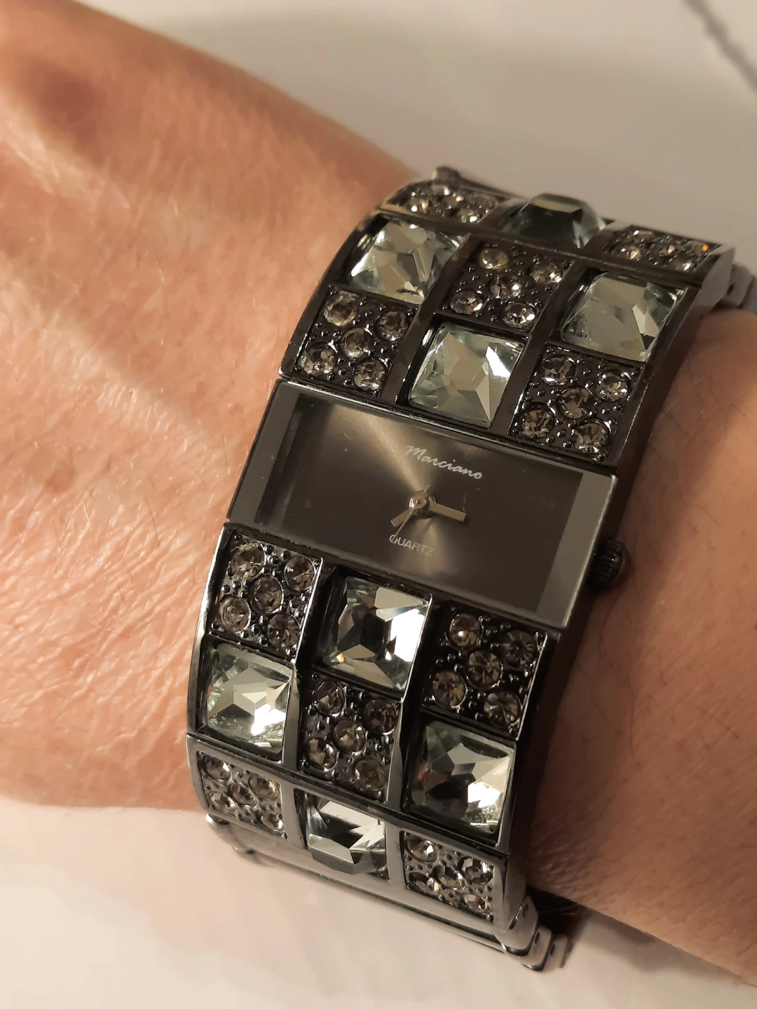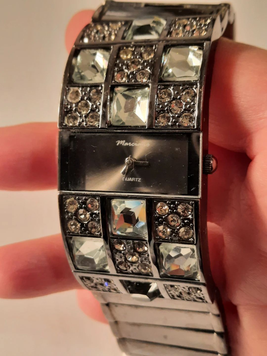 Sparkling watch with a rectangular face and a stone-encrusted band. It features a quartz movement. Stainless steel back made in China.not new,show few wares.but looking great.clen condition.