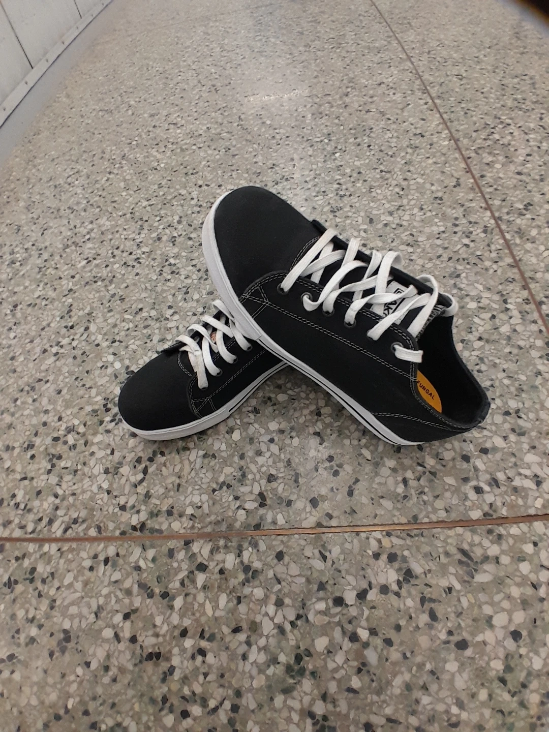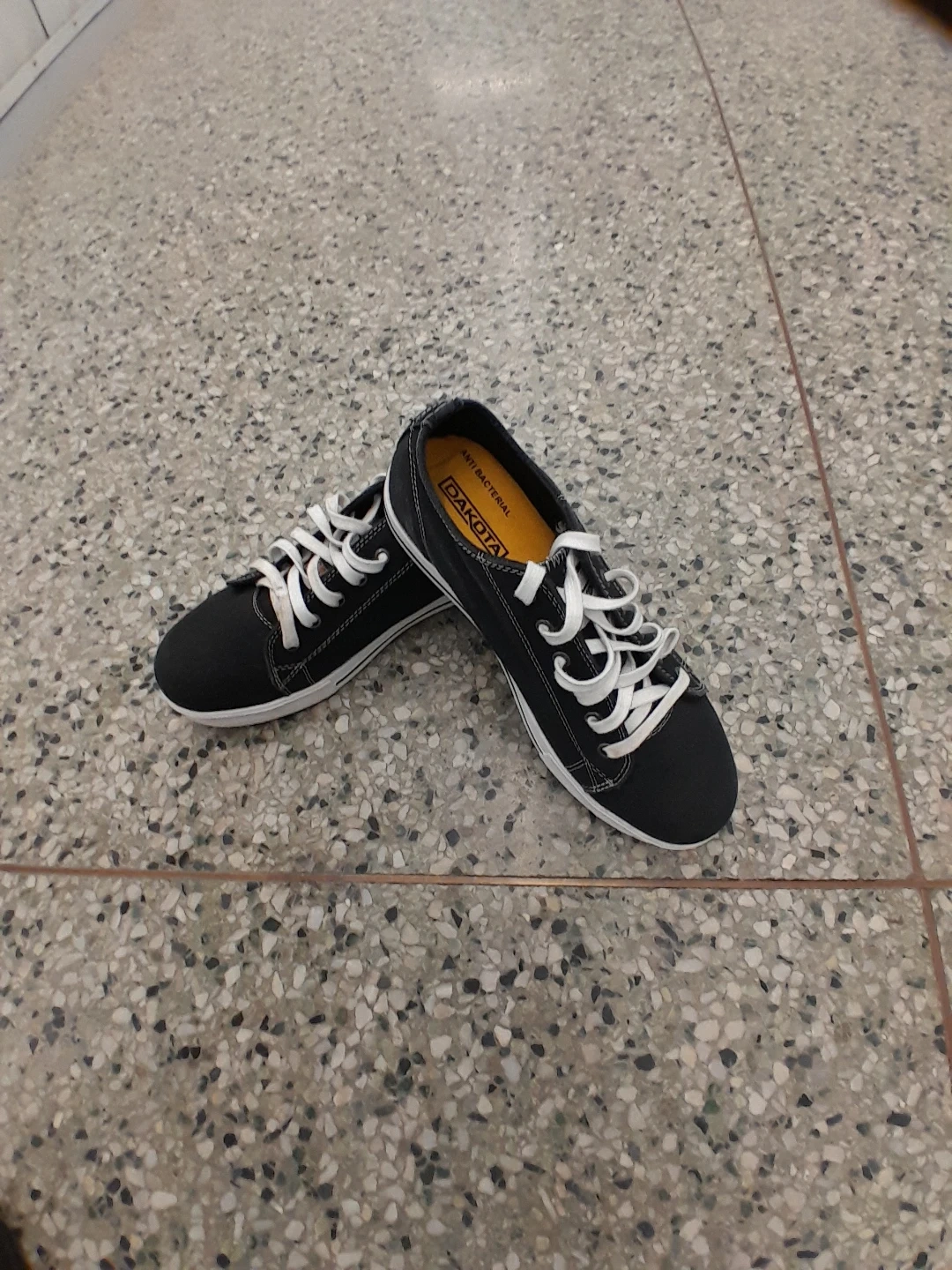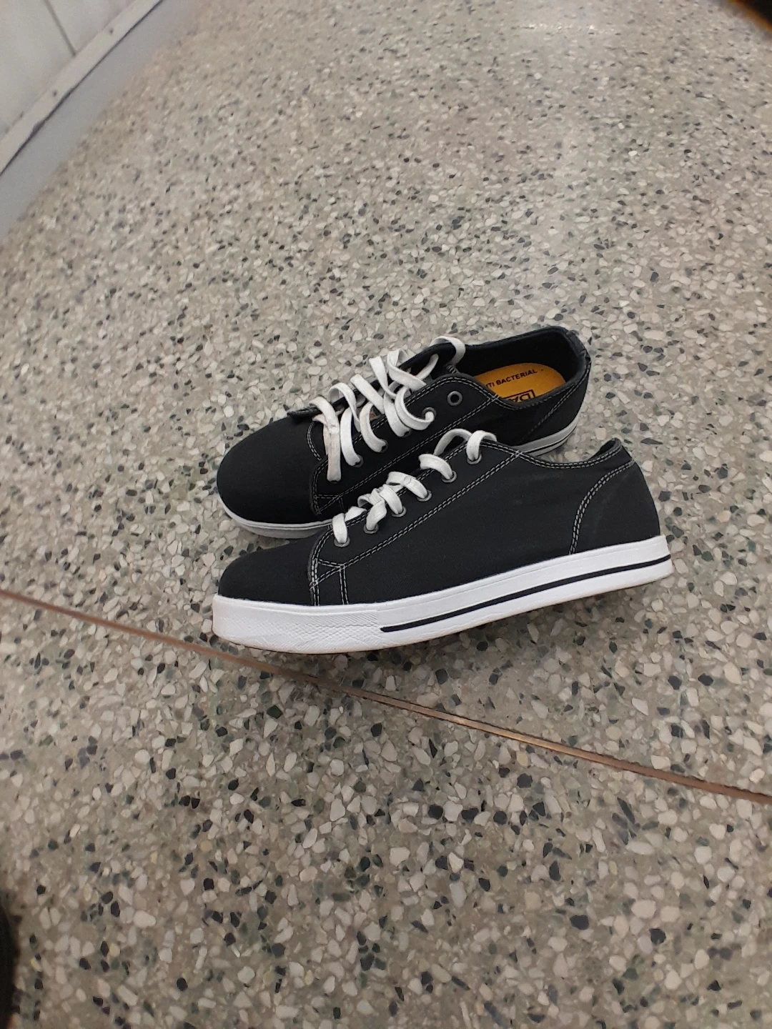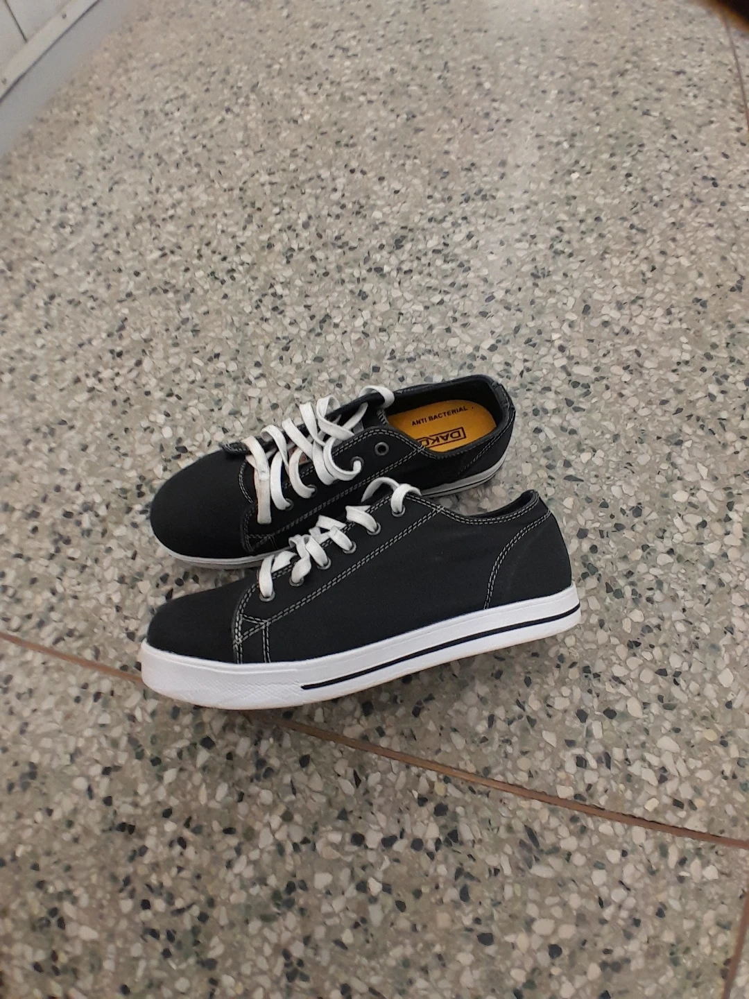 Dakota black canvas low-top sneakers. They're anti-bacterial and have white laces and soles. A great pair for everyday wear! Women's safety shoes size 9