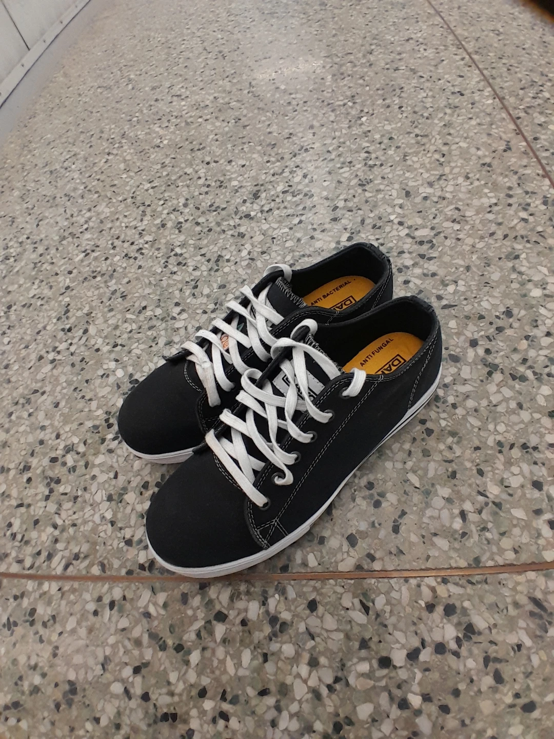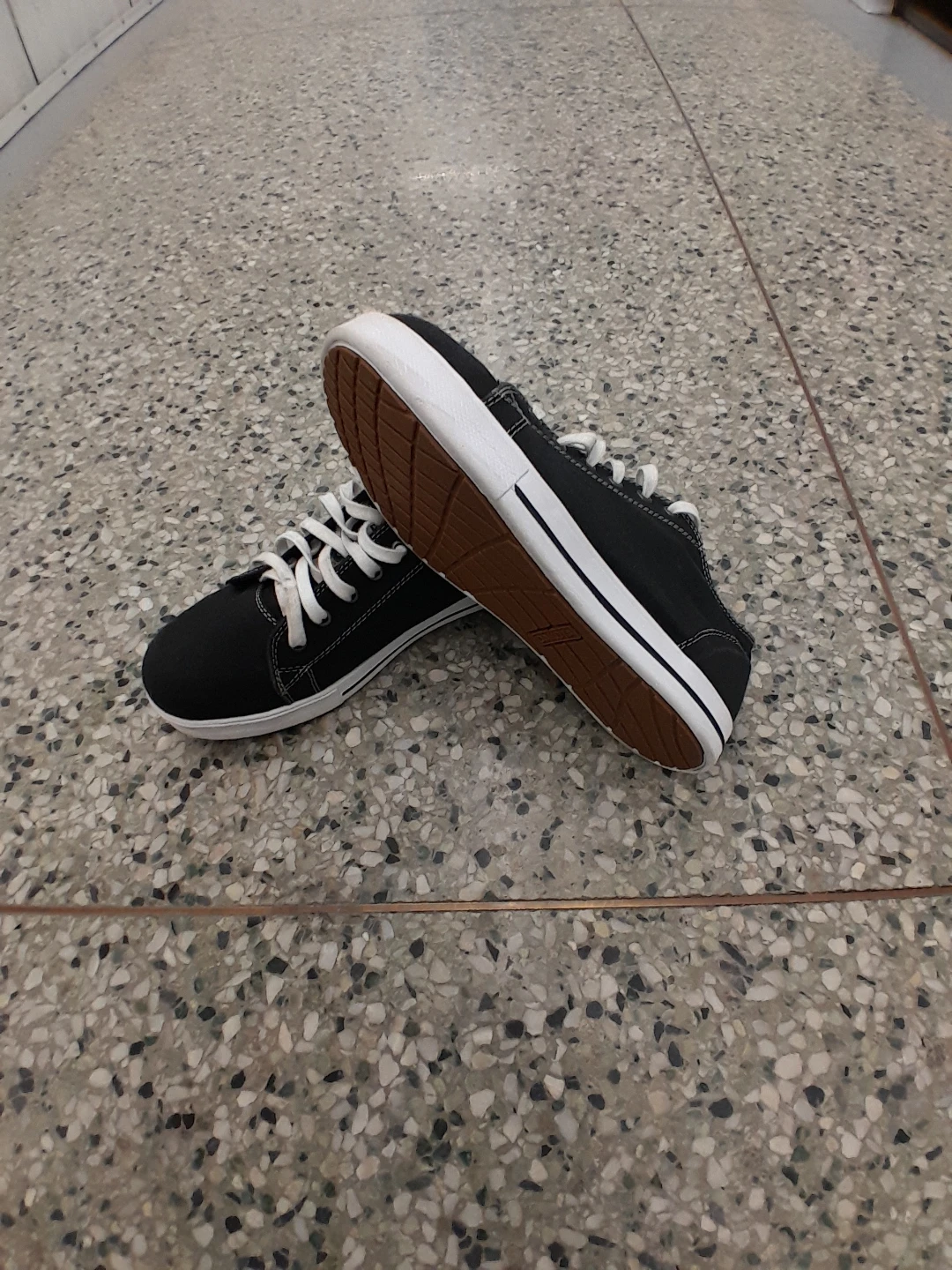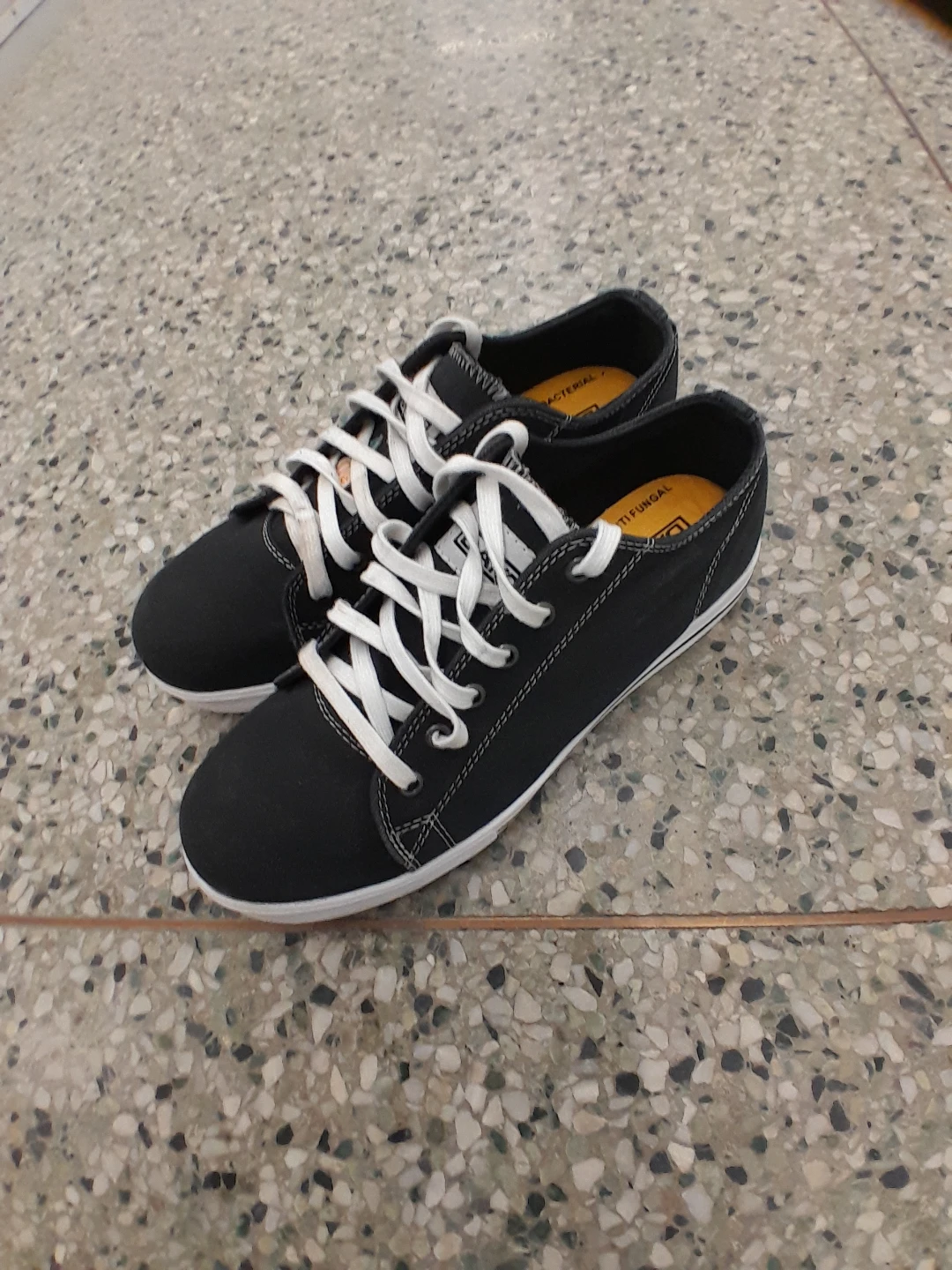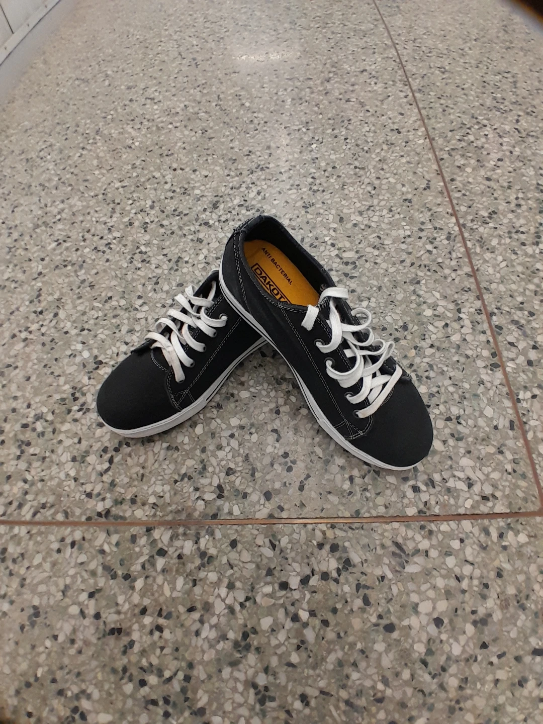 Dakota black canvas low-top sneakers. They're anti-bacterial and have white laces and soles. A great pair for everyday wear! Women's safety shoes size 9