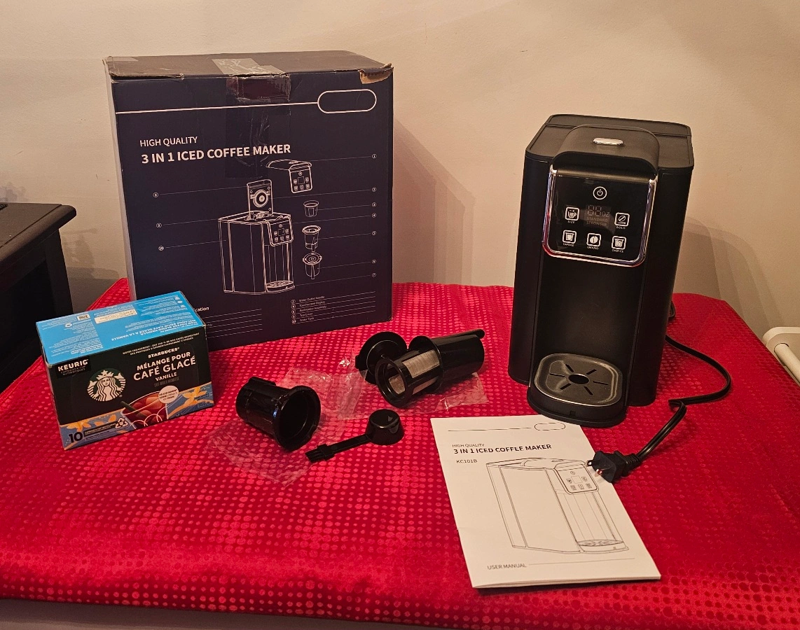 3-in-1 iced coffee maker (Hot or Iced) Makes coffee from grounds, K-cups, and pods. 8oz to 14oz.