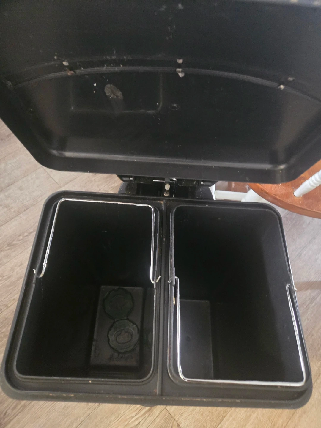 This stainless steel trash can has two separate compartments for easy sorting. It features a convenient step pedal for hands-free operation. The brushed metal finish looks sharp in any kitchen or workspace!