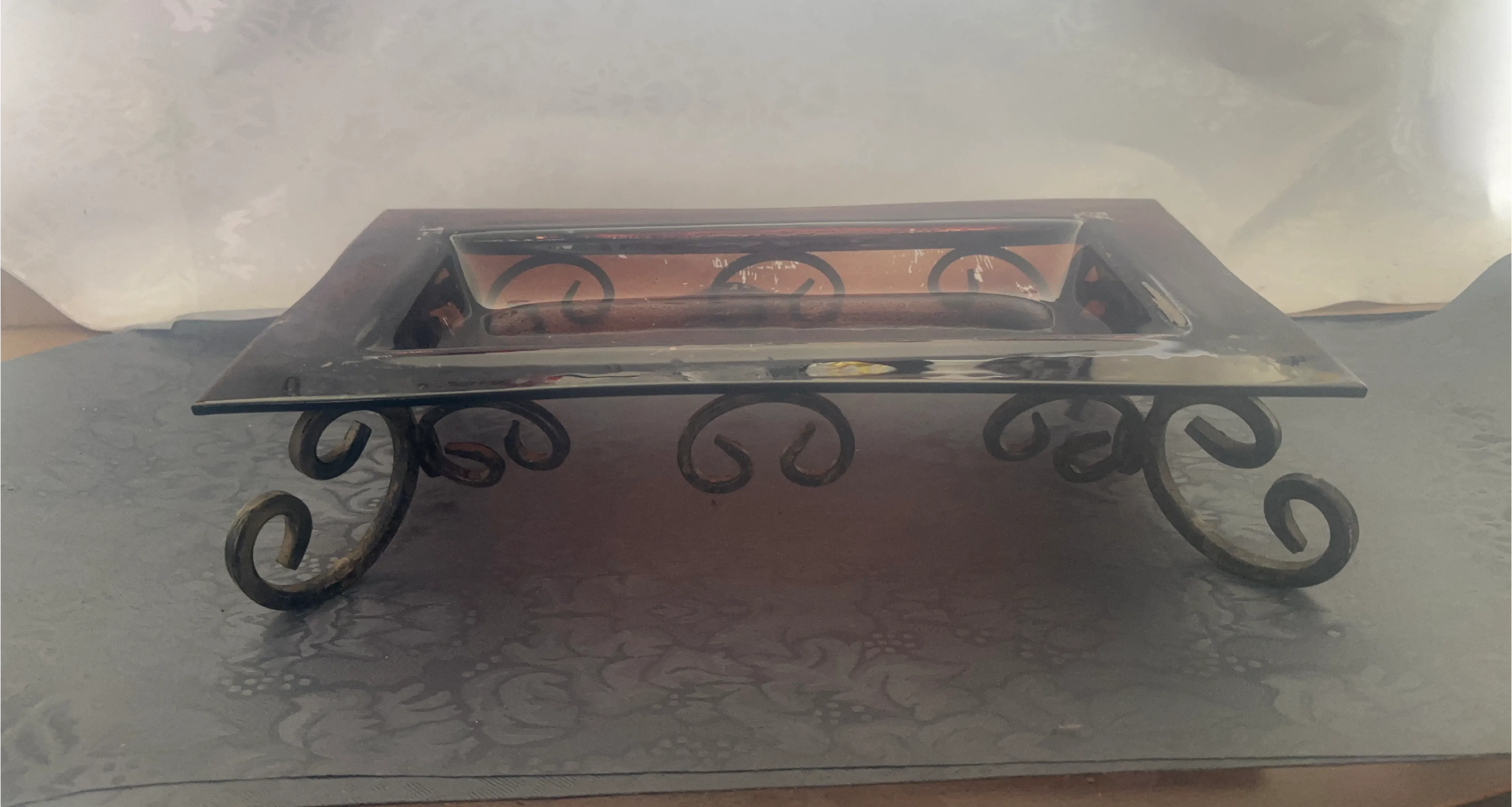Dark brown rectangular serving tray with a metallic ornate stand. The tray has decorative scrollwork visible underneath. It's perfect for serving appetizers or as a decorative piece.