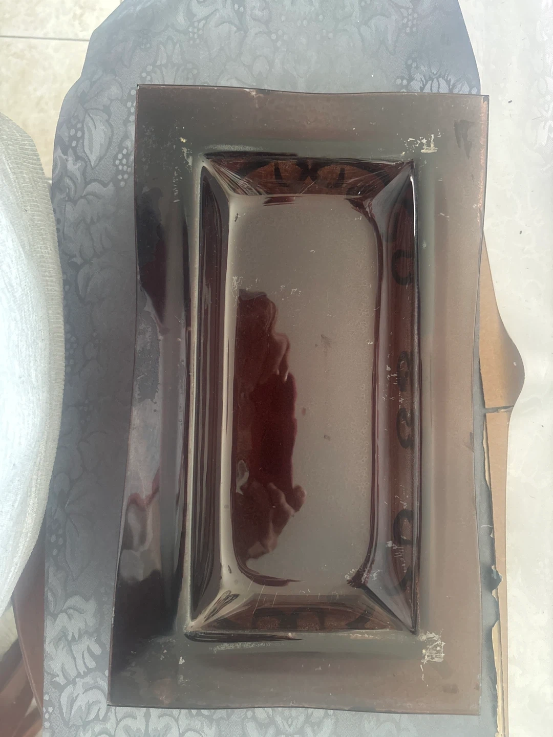 Dark brown rectangular serving tray with a metallic ornate stand. The tray has decorative scrollwork visible underneath. It's perfect for serving appetizers or as a decorative piece.