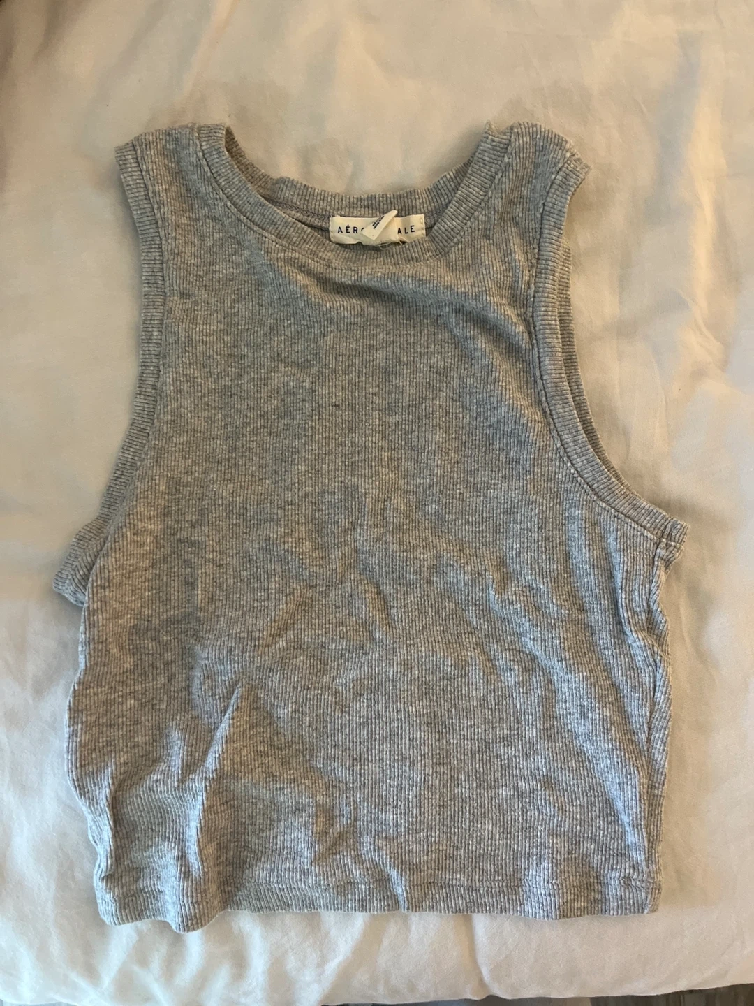 A cute and simple grey tank top from Aeropostale! It's a size small, perfect for layering or wearing on its own. The material is soft and comfortable, making it a great addition to your wardrobe!