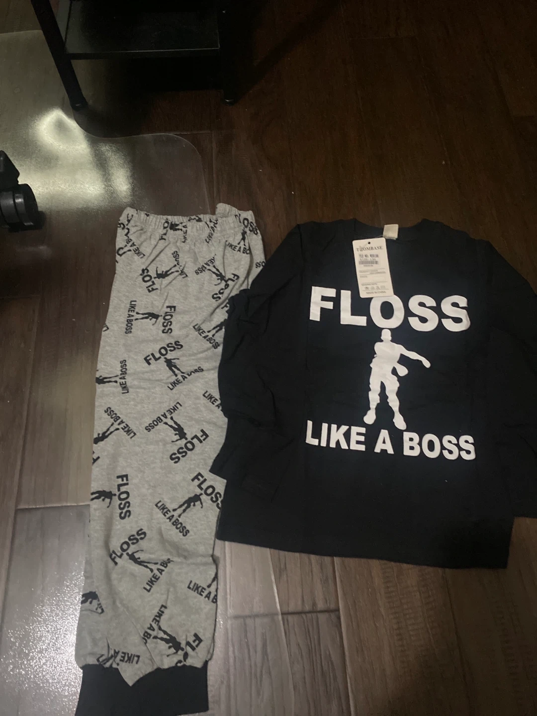 This is a Trombase pajama set with a long-sleeved shirt and pants. Both pieces feature a "Floss Like A Boss" graphic. It's made of soft material for comfortable sleepwear.kids for boys size 130