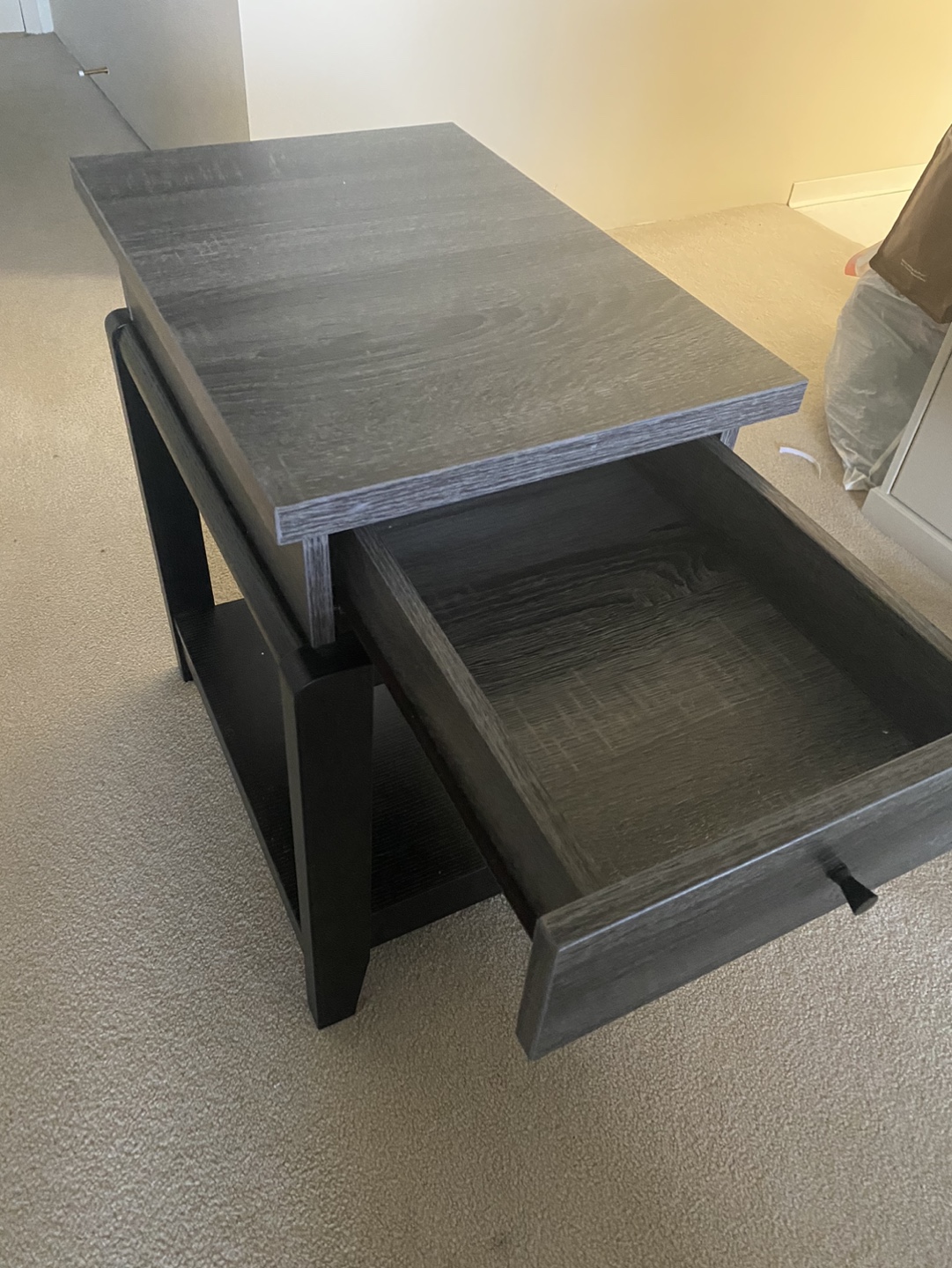 Small, grey veneer night stand. Very little wear and tear. Only one visible scratch on the bottom shelf.