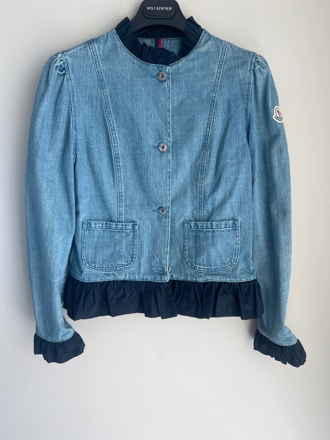 Here's a stylish Moncler denim jacket! It features a unique design with a ruffled collar and cuffs, and a flattering fit. The jacket is in great condition and ready for a new home. Perfect for adding a touch of designer flair to your wardrobe