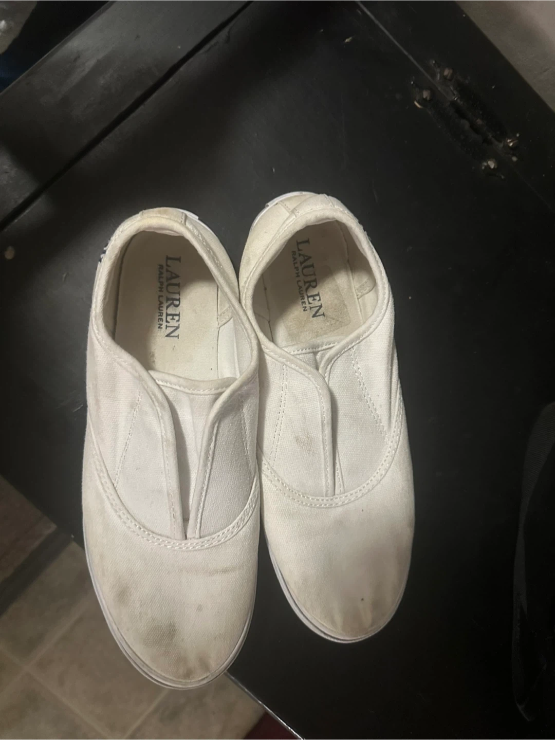 Selling a pair of Ralph Lauren slip-on shoes in white. They show some signs of wear, but still have lots of life left! Perfect for casual outings