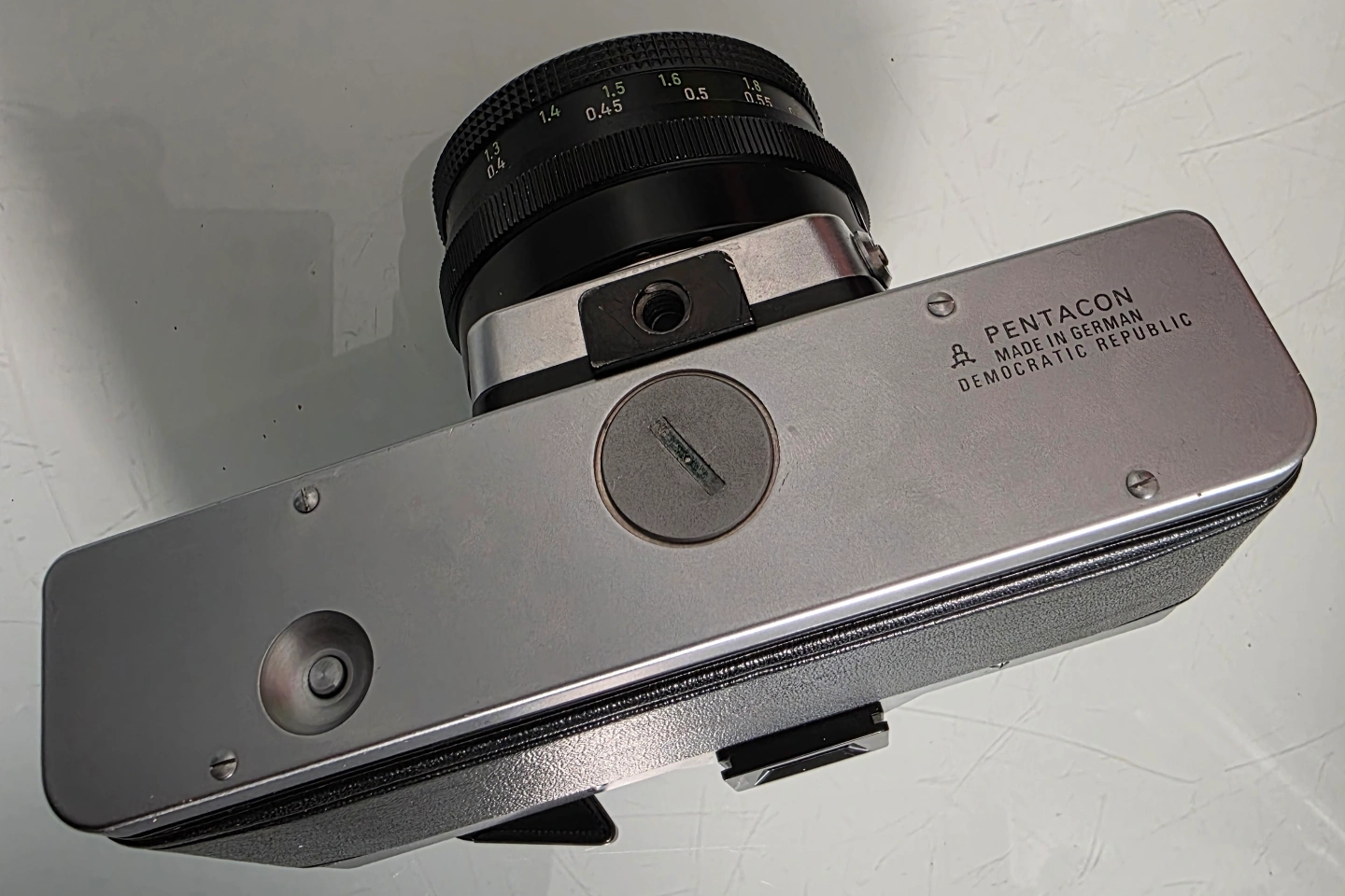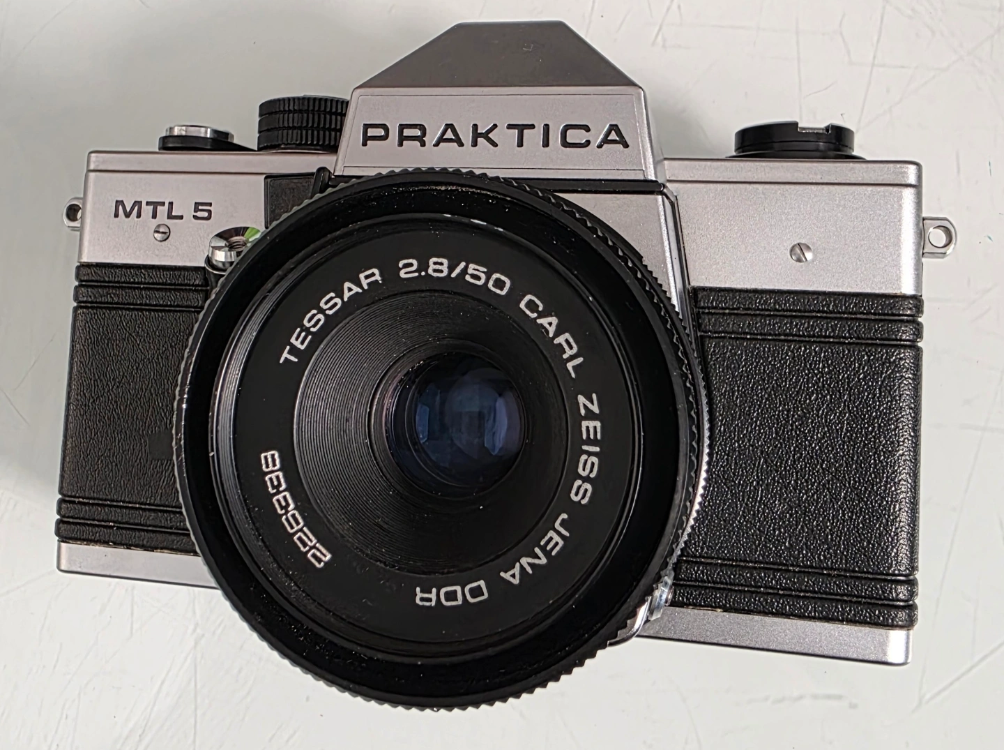 Vintage Praktica MTL5 35mm film camera. Silver body, black leatherette covering. Carl Zeiss Tessar 2.8/50 lens included. Pentacon made in German Democratic Republic. Manual focus, mechanical shutter.