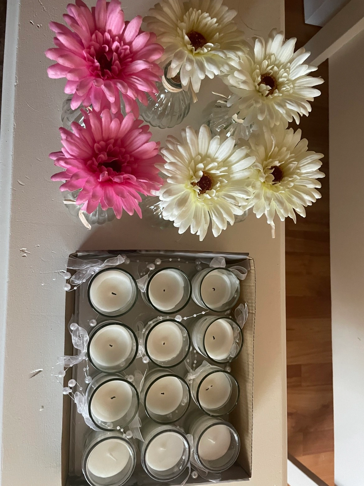 Daisies in vases and candles. Several candles have been used. 7 daisies (pink and white) 12 candles (white in holders) only 6 daisies in pic but there are 7.