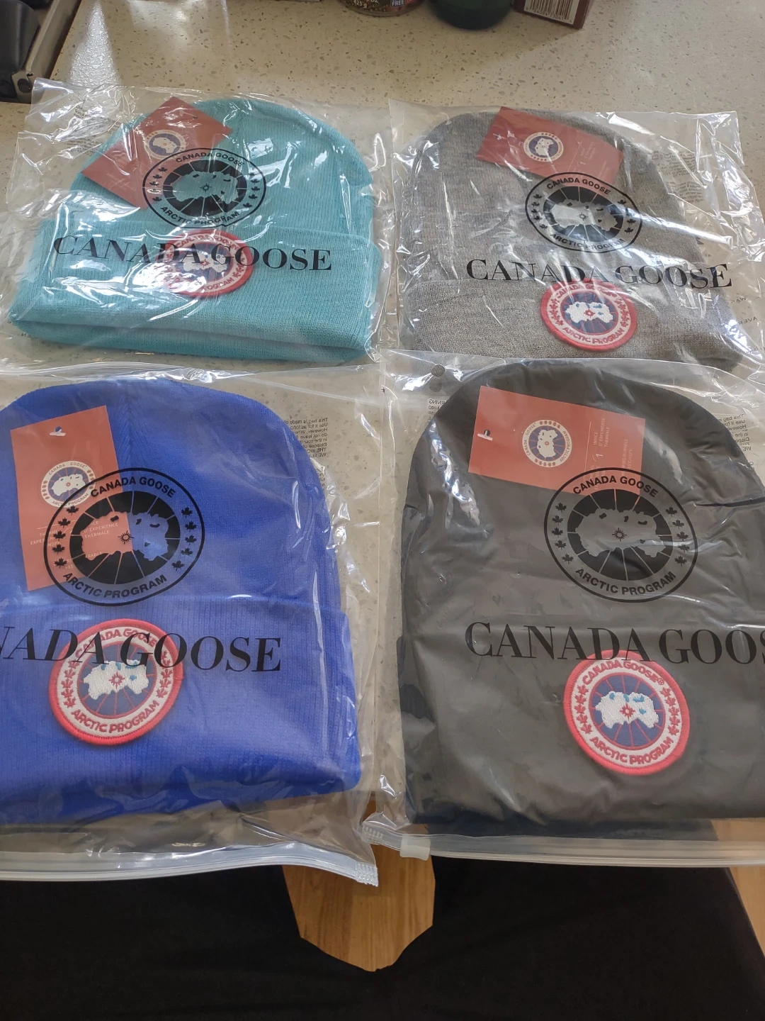 Set of four Canada Goose beanies in blue, teal, gray, and black. Each beanie is individually packaged.