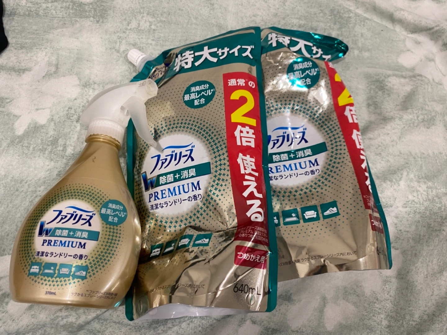 1.5 large refills and one spray bottle of Fabreeze Premium disinfectant and deodorizer. Clean laundry scent. Great for eliminating odours.