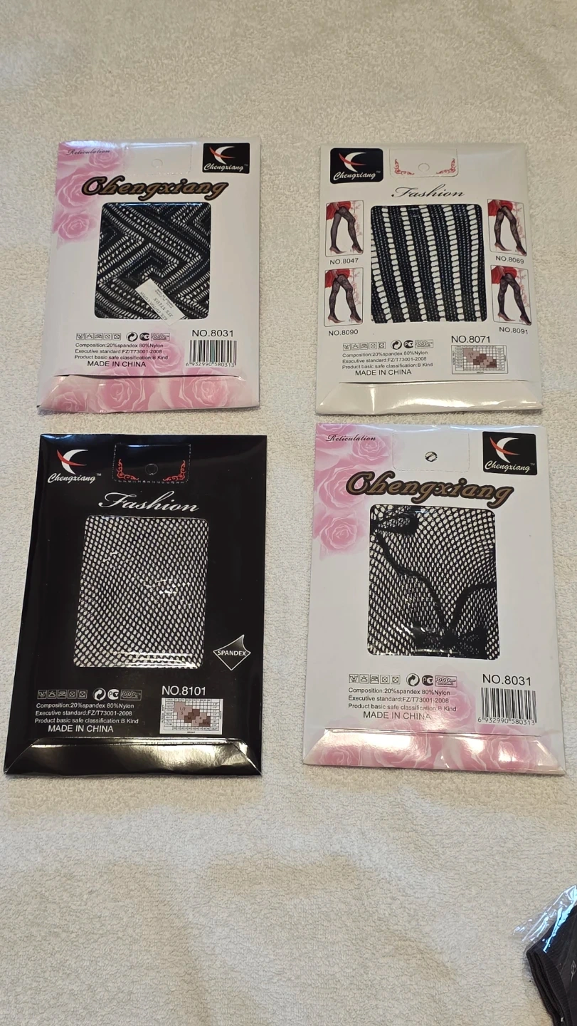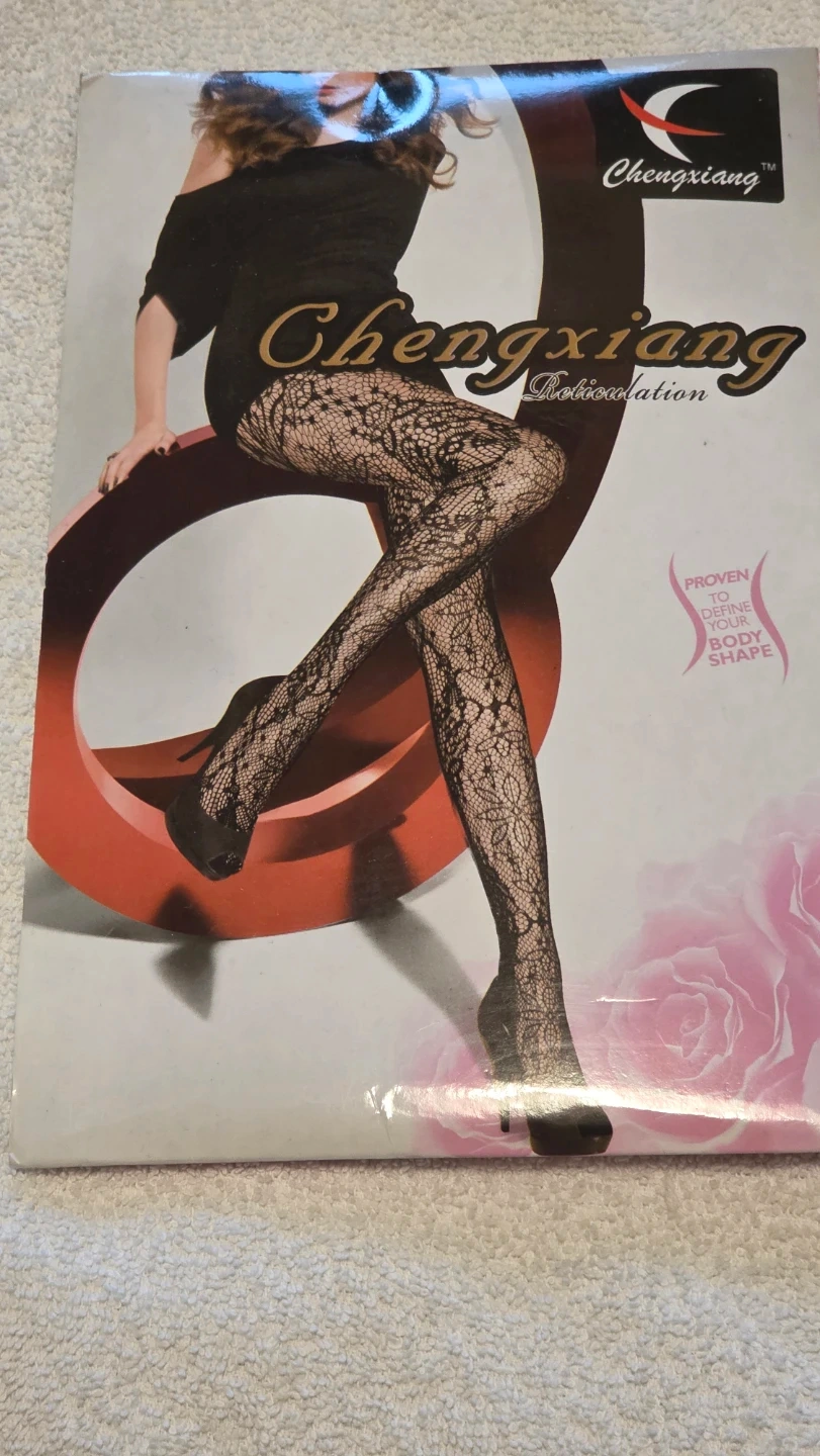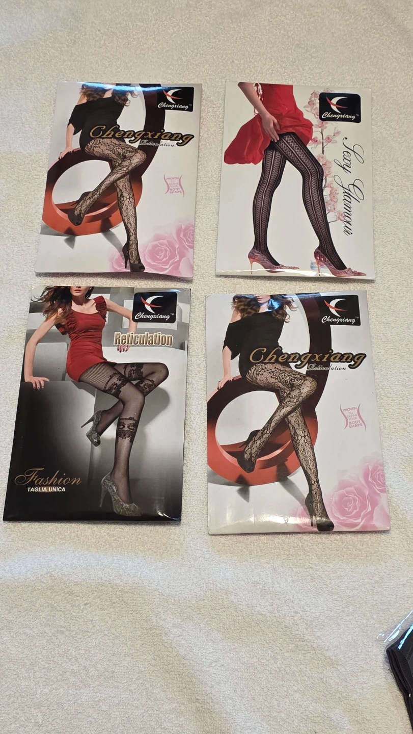 A set of four Chengxiang brand tights, featuring various fashionable patterns like "Reticulation" and "Sexy Glamour". They are made with a blend of spandex, nylon, and cotton. These are "Taglia Unica" or one-size-fits-all.