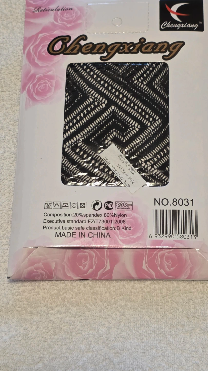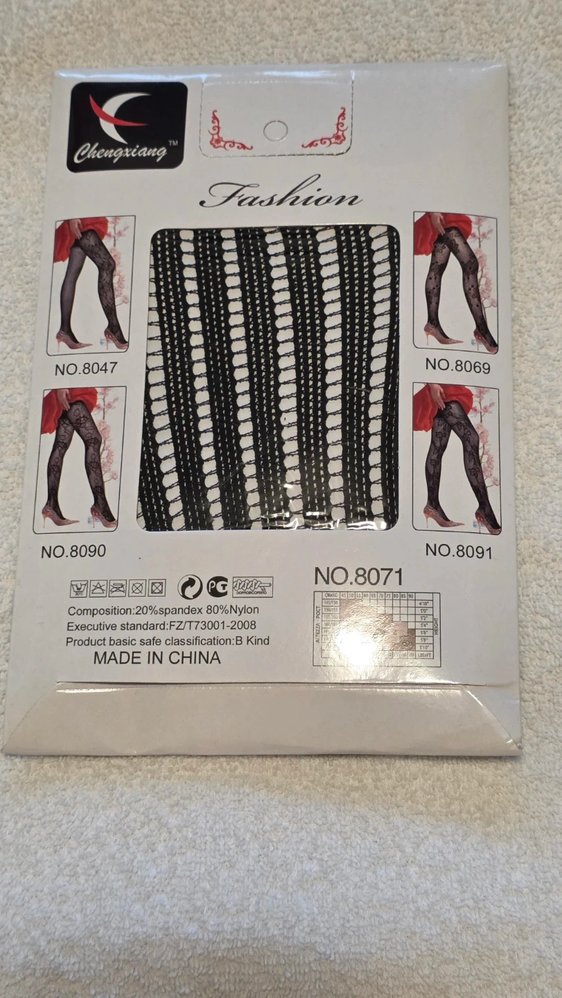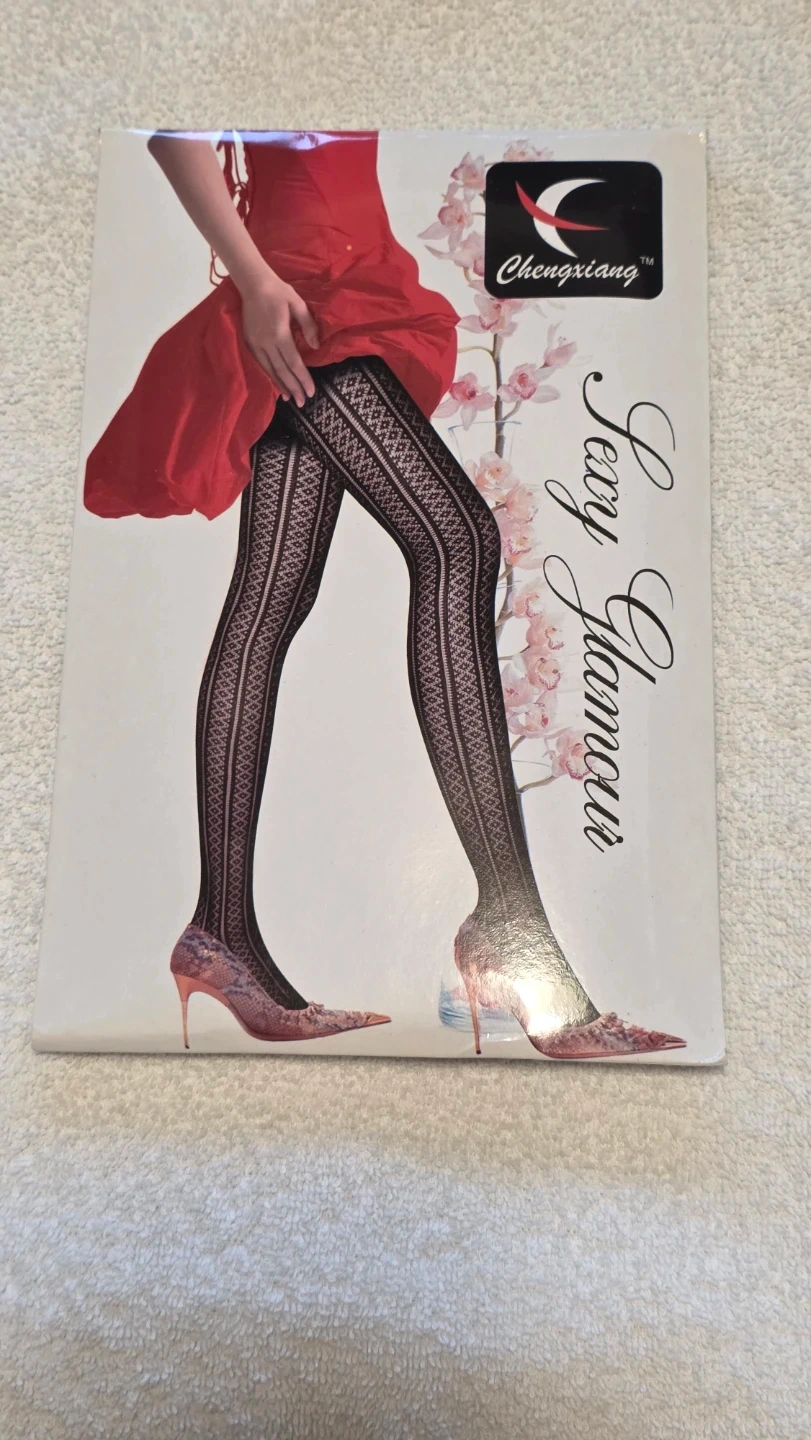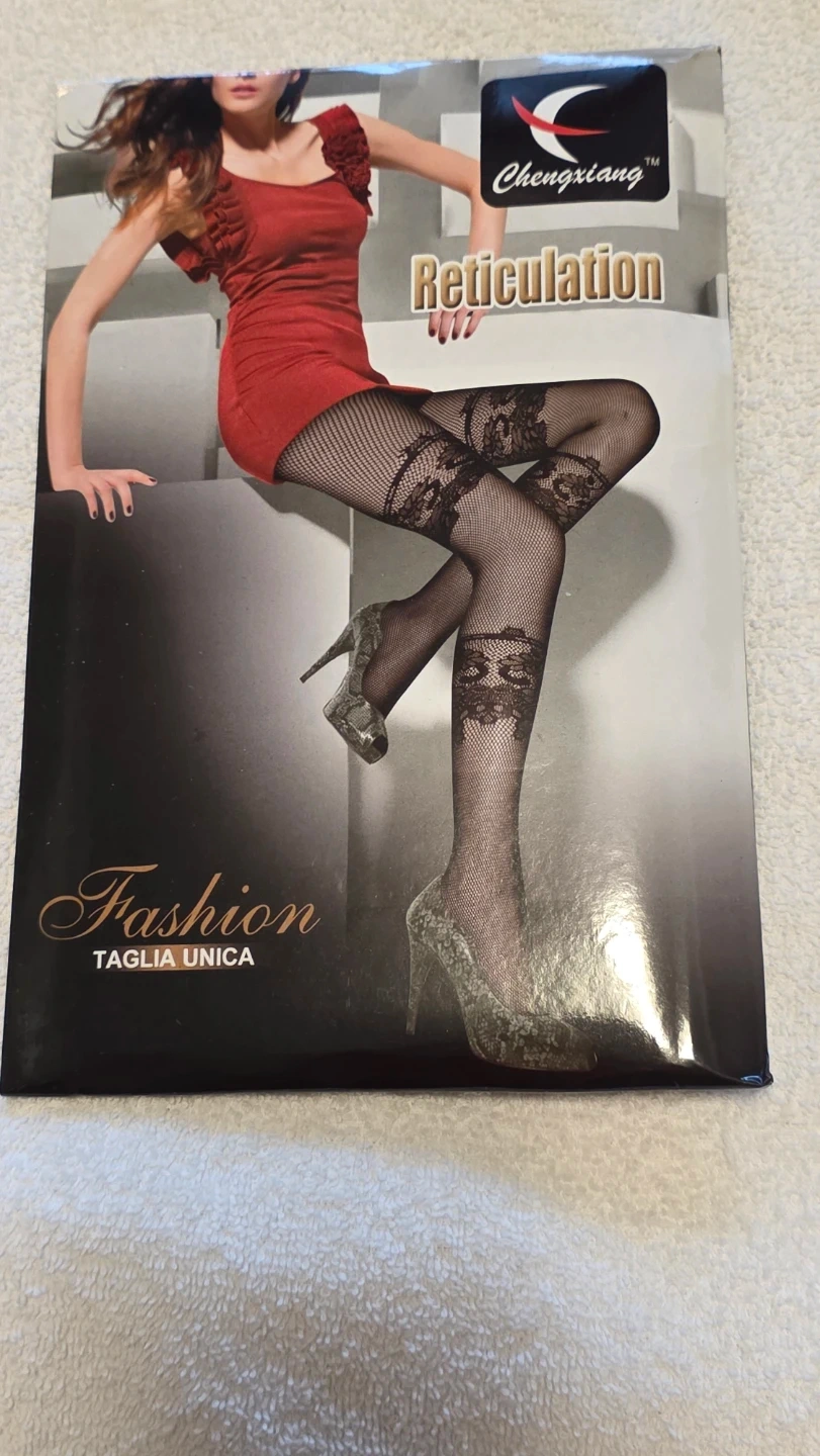 A set of four Chengxiang brand tights, featuring various fashionable patterns like "Reticulation" and "Sexy Glamour". They are made with a blend of spandex, nylon, and cotton. These are "Taglia Unica" or one-size-fits-all.