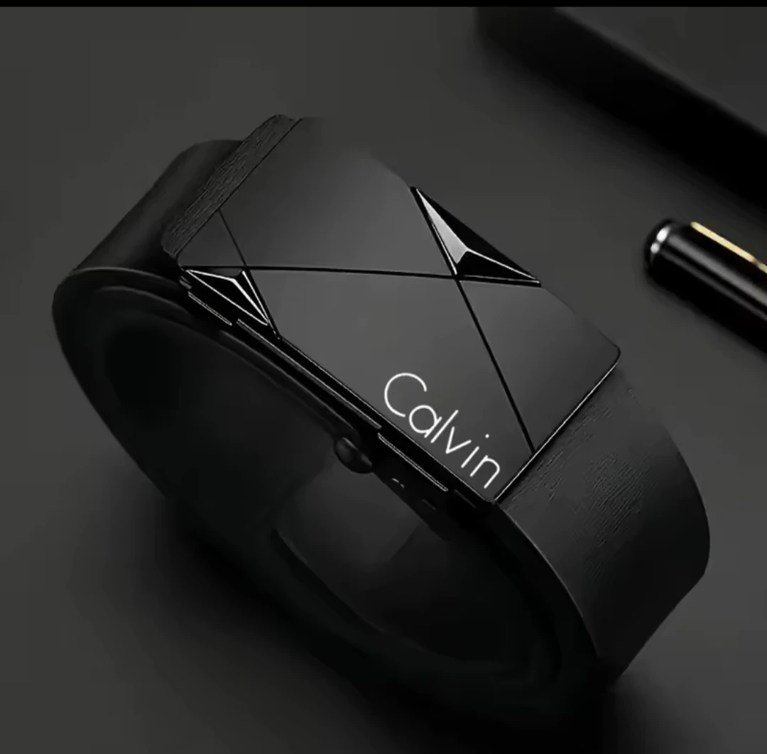 This is a black belt with a stylish buckle featuring a geometric design. It's made with a durable material suitable for everyday wear. This belt offers a sleek look for various outfits.
