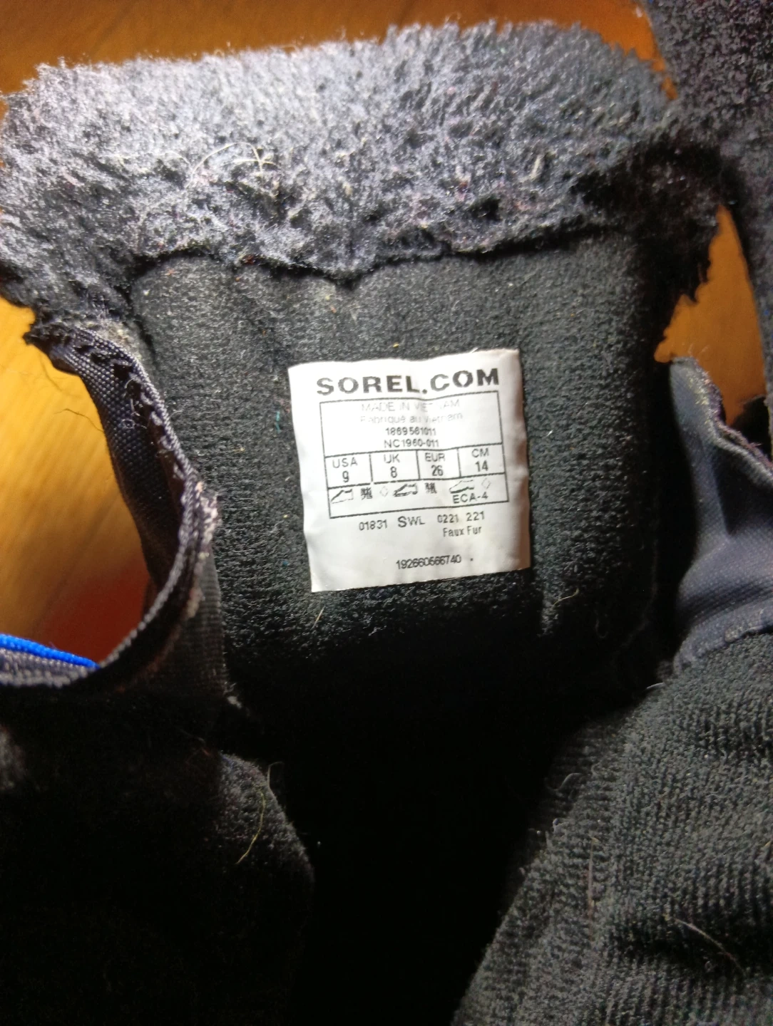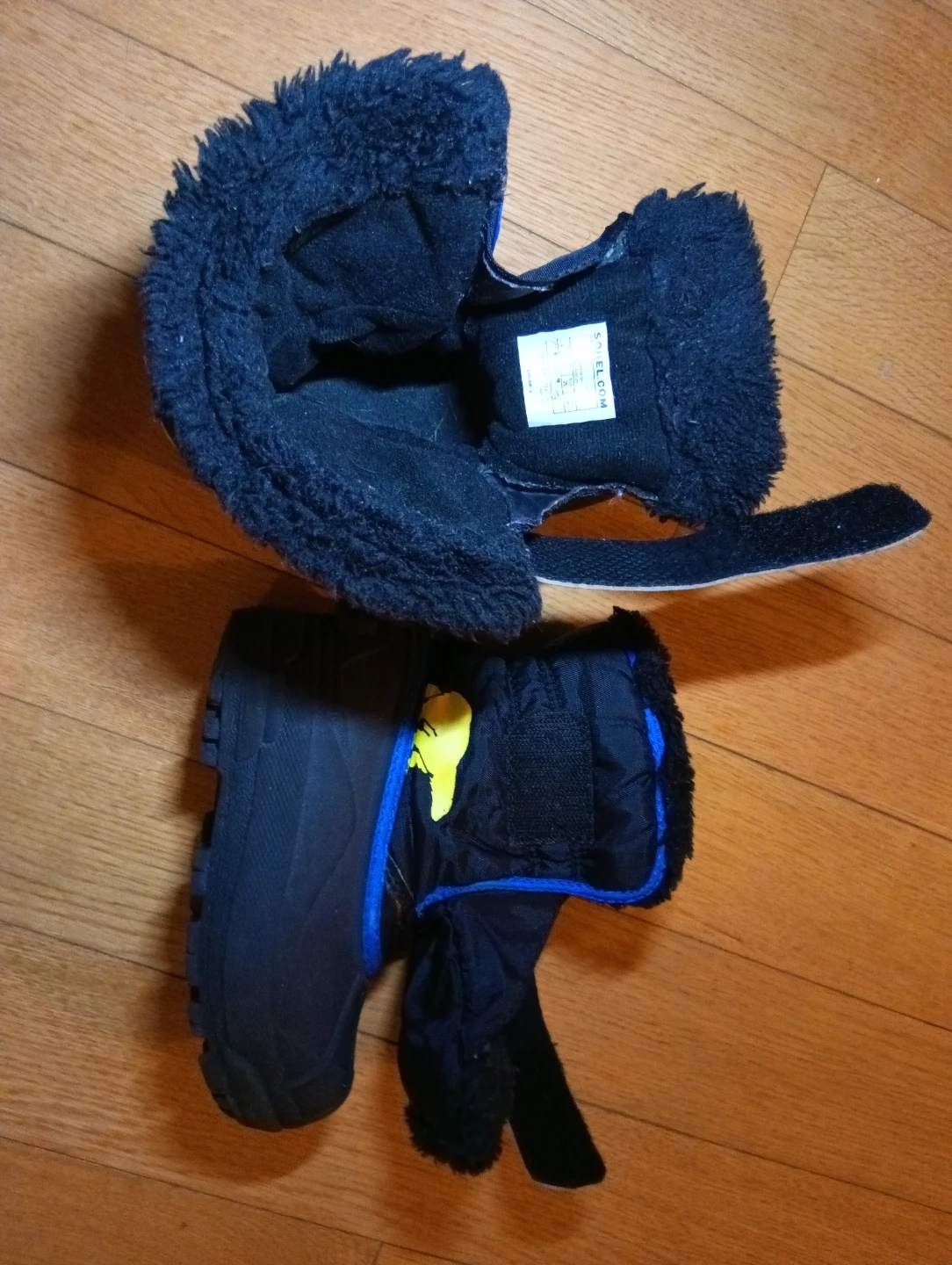 Sorel winter boots in black with blue and yellow accents. These kids' boots are a size 9 US, 8 UK, and 26 EUR. They feature a faux fur lining for extra warmth.