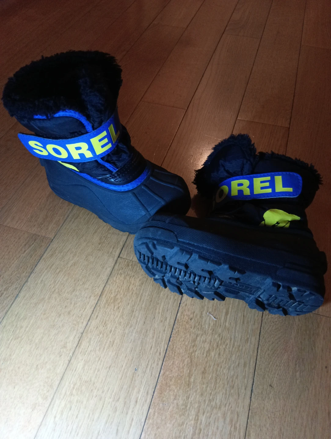 Sorel winter boots in black with blue and yellow accents. These kids' boots are a size 9 US, 8 UK, and 26 EUR. They feature a faux fur lining for extra warmth.