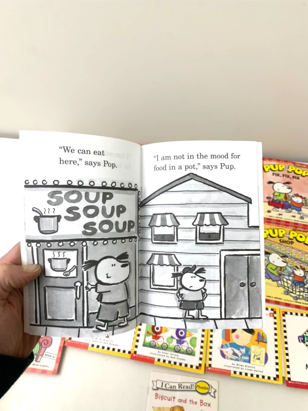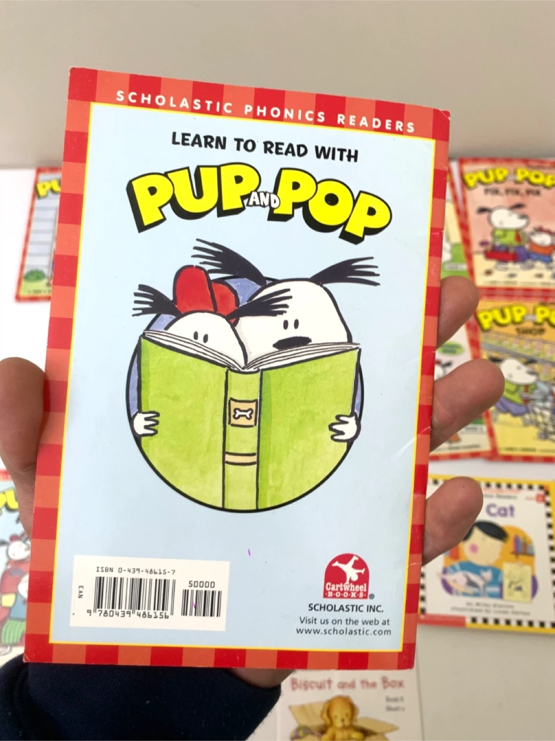 A collection of Scholastic Phonics Readers books featuring the Pup and Pop series, along with other My First Phonics Readers titles. These books are great for early readers learning phonics.