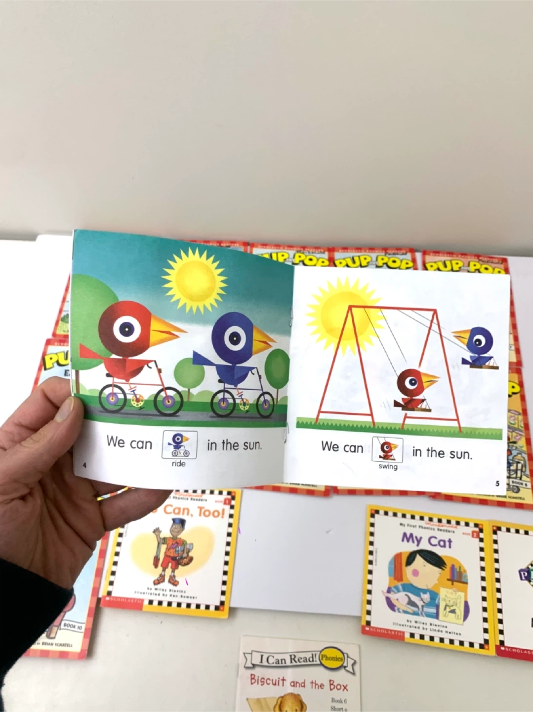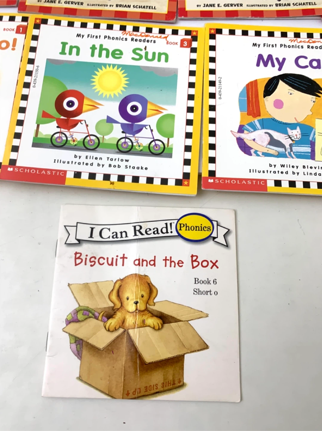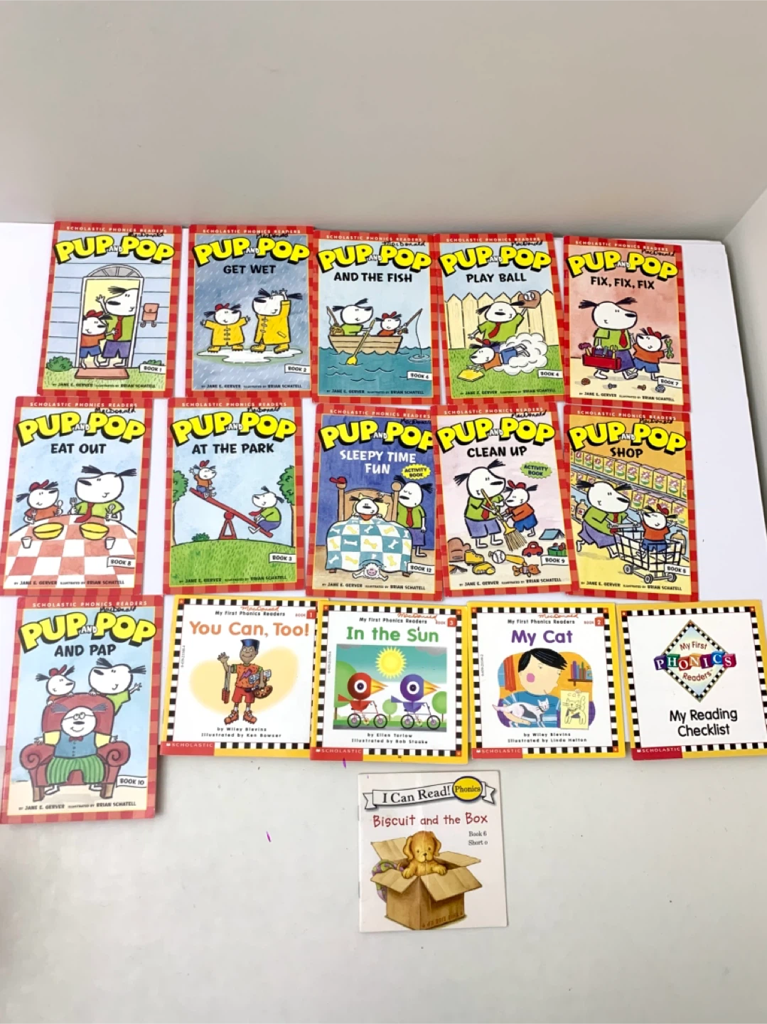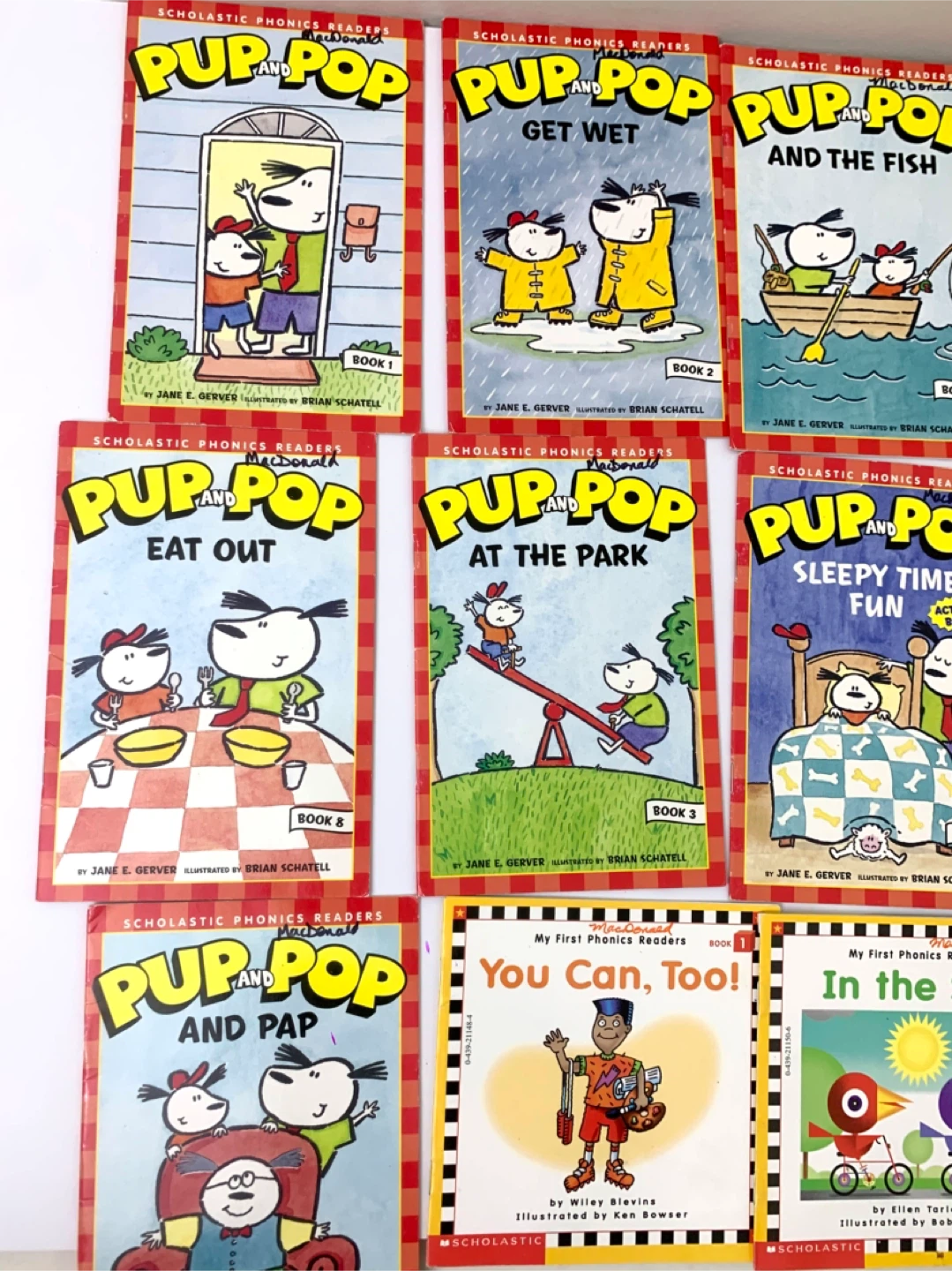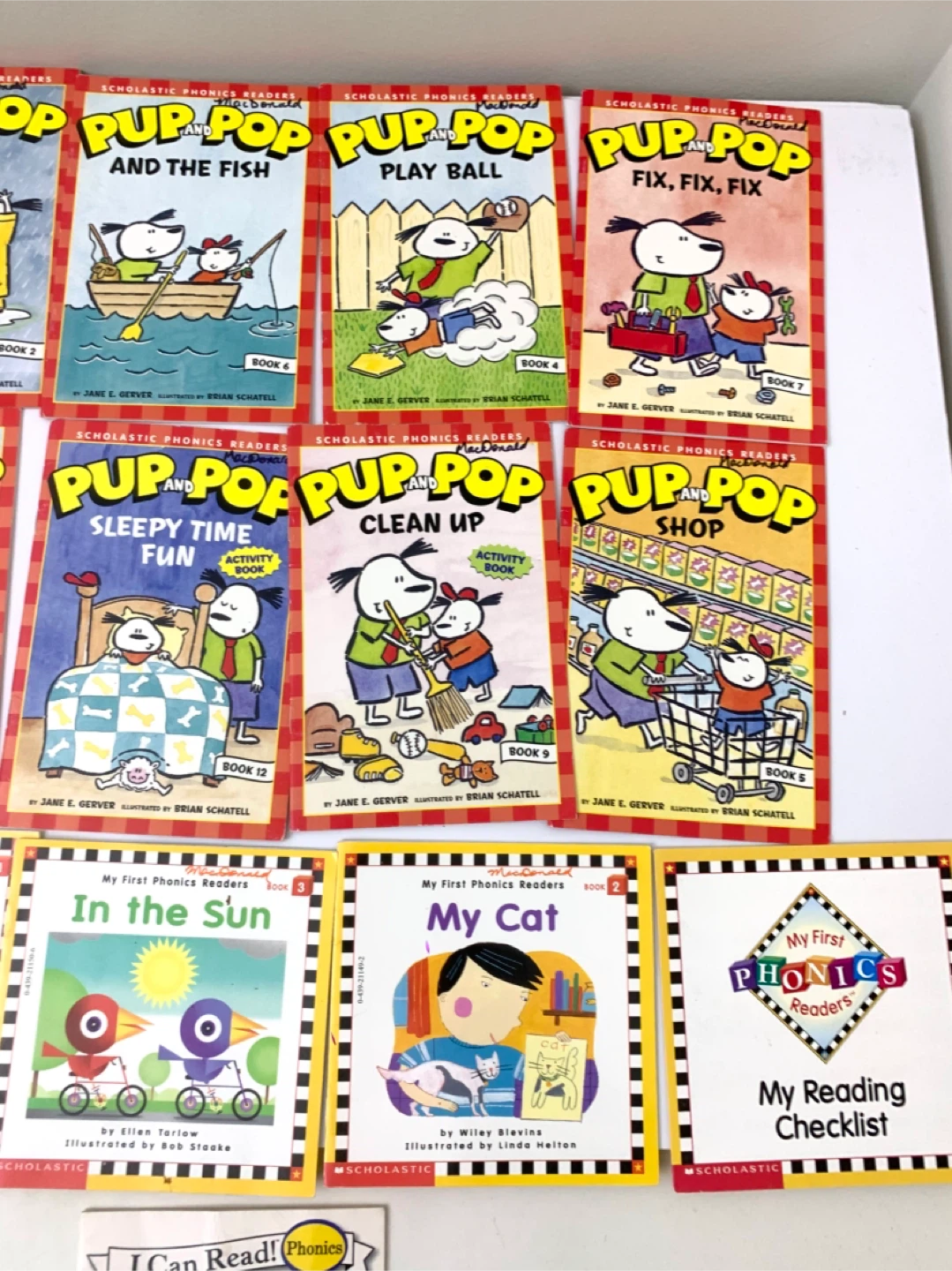 A collection of Scholastic Phonics Readers books featuring the Pup and Pop series, along with other My First Phonics Readers titles. These books are great for early readers learning phonics.