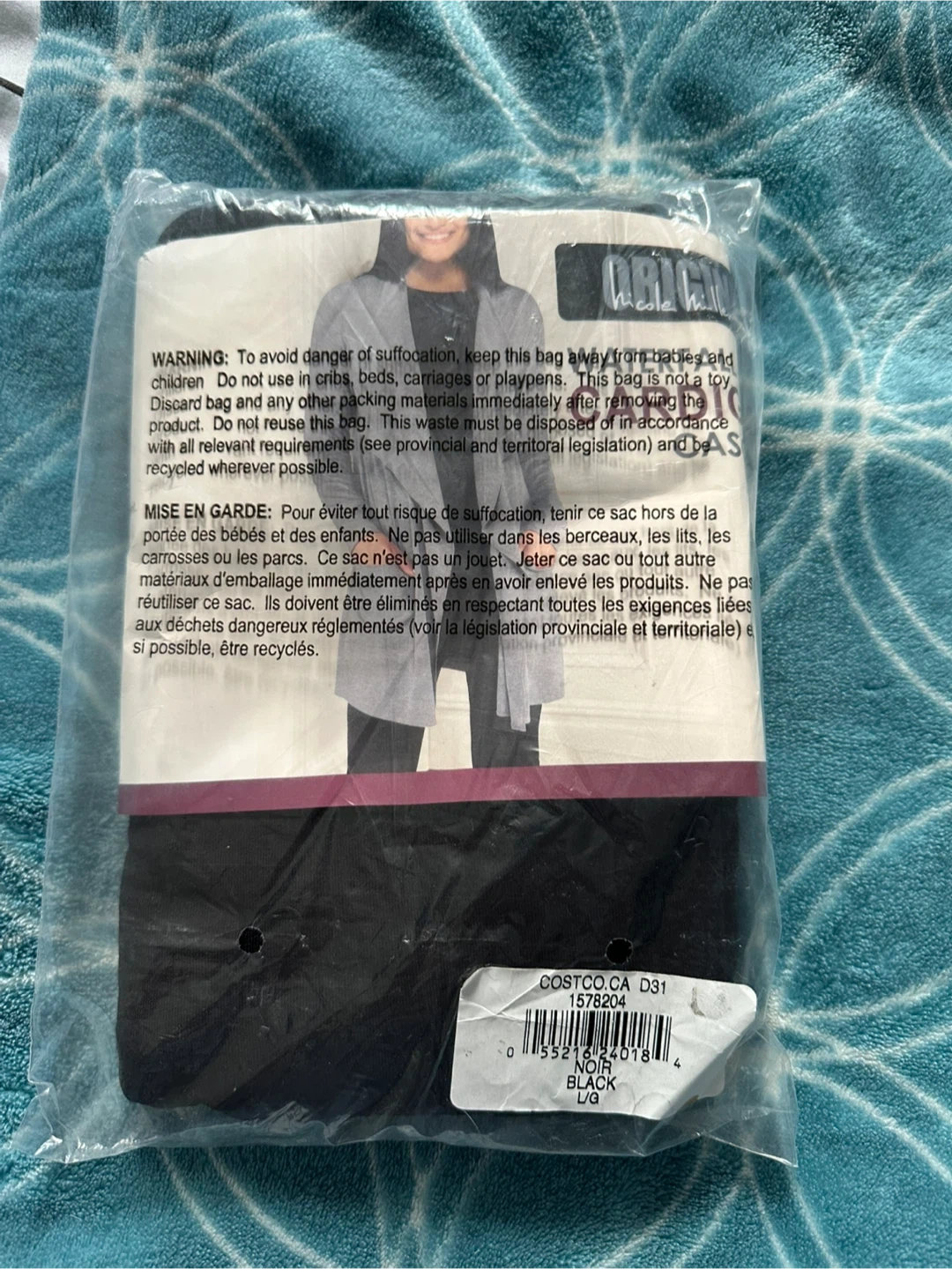 Nicole Miller Women's Waterfall Cardigan Size: large Colour: black Composition: 95% Rayon, 5% Spandex Front pockets Waterfall draped effect on front Lightweight Machine wash cold