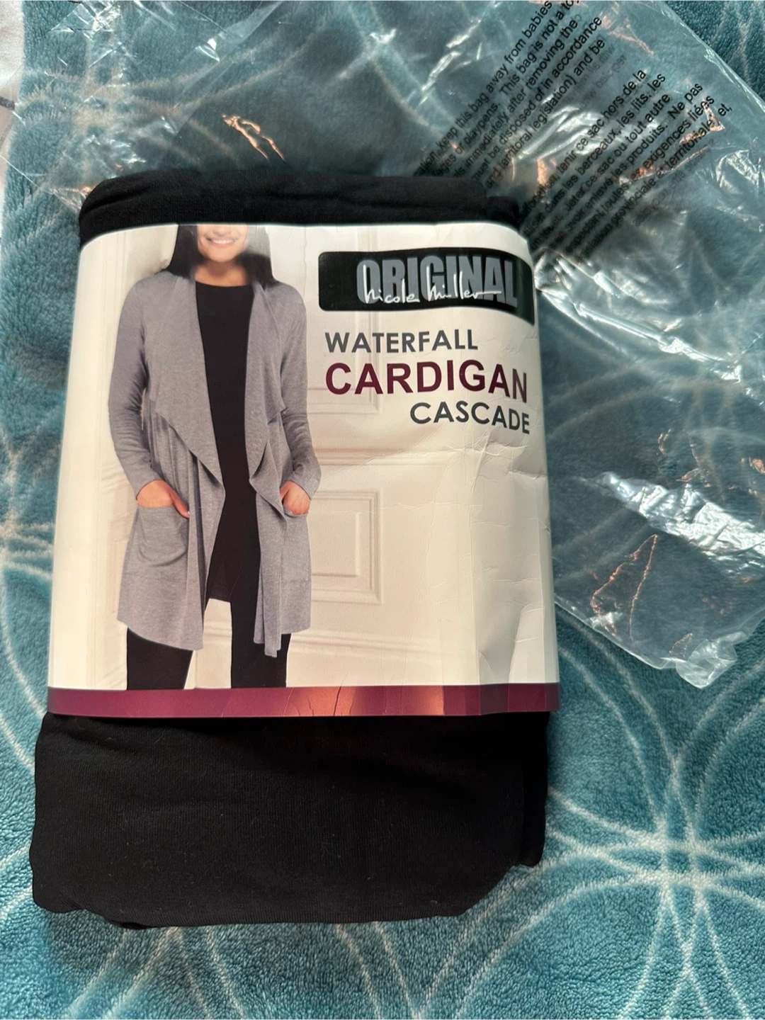 Nicole Miller Women's Waterfall Cardigan Size: large Colour: black Composition: 95% Rayon, 5% Spandex Front pockets Waterfall draped effect on front Lightweight Machine wash cold