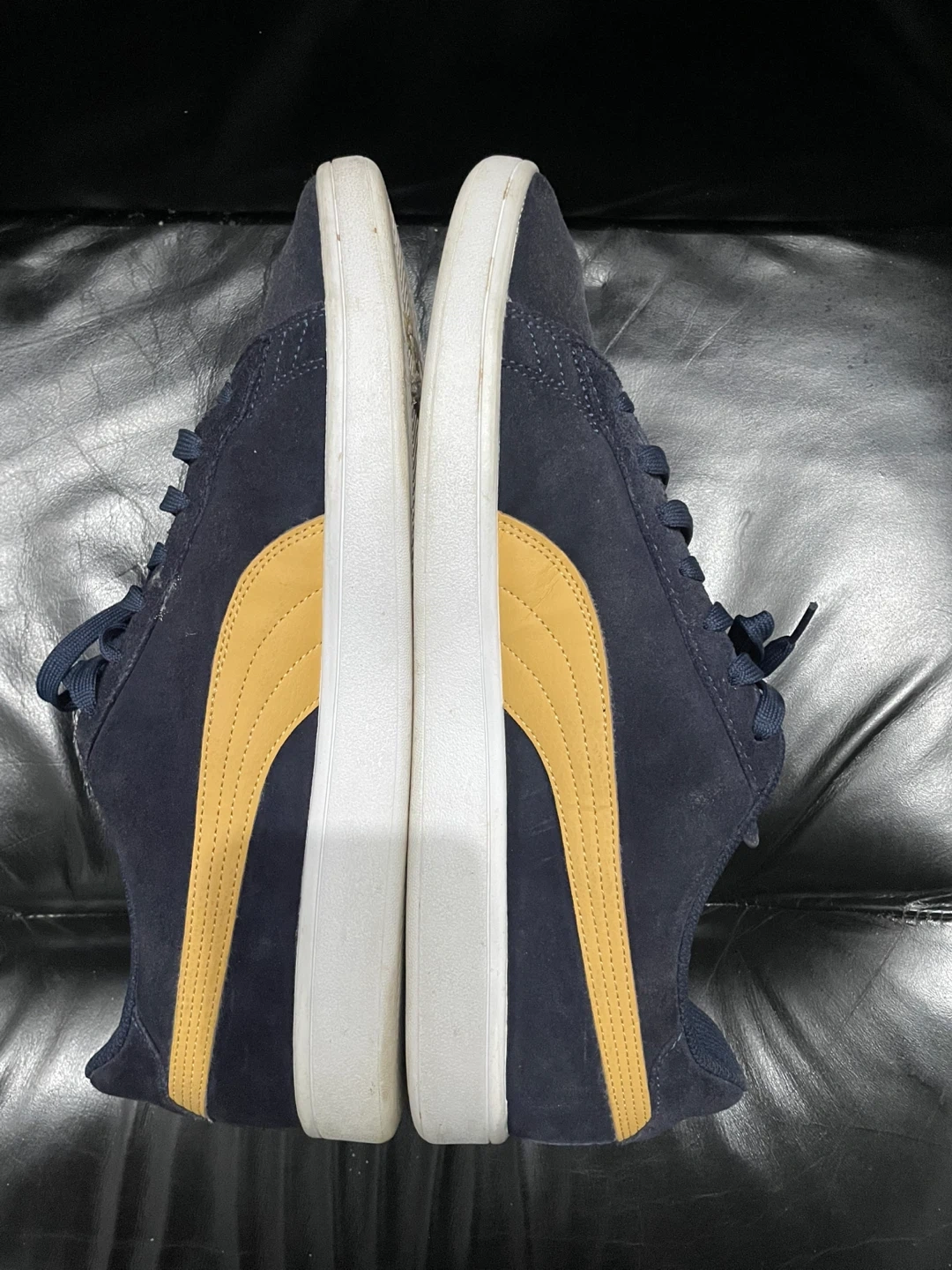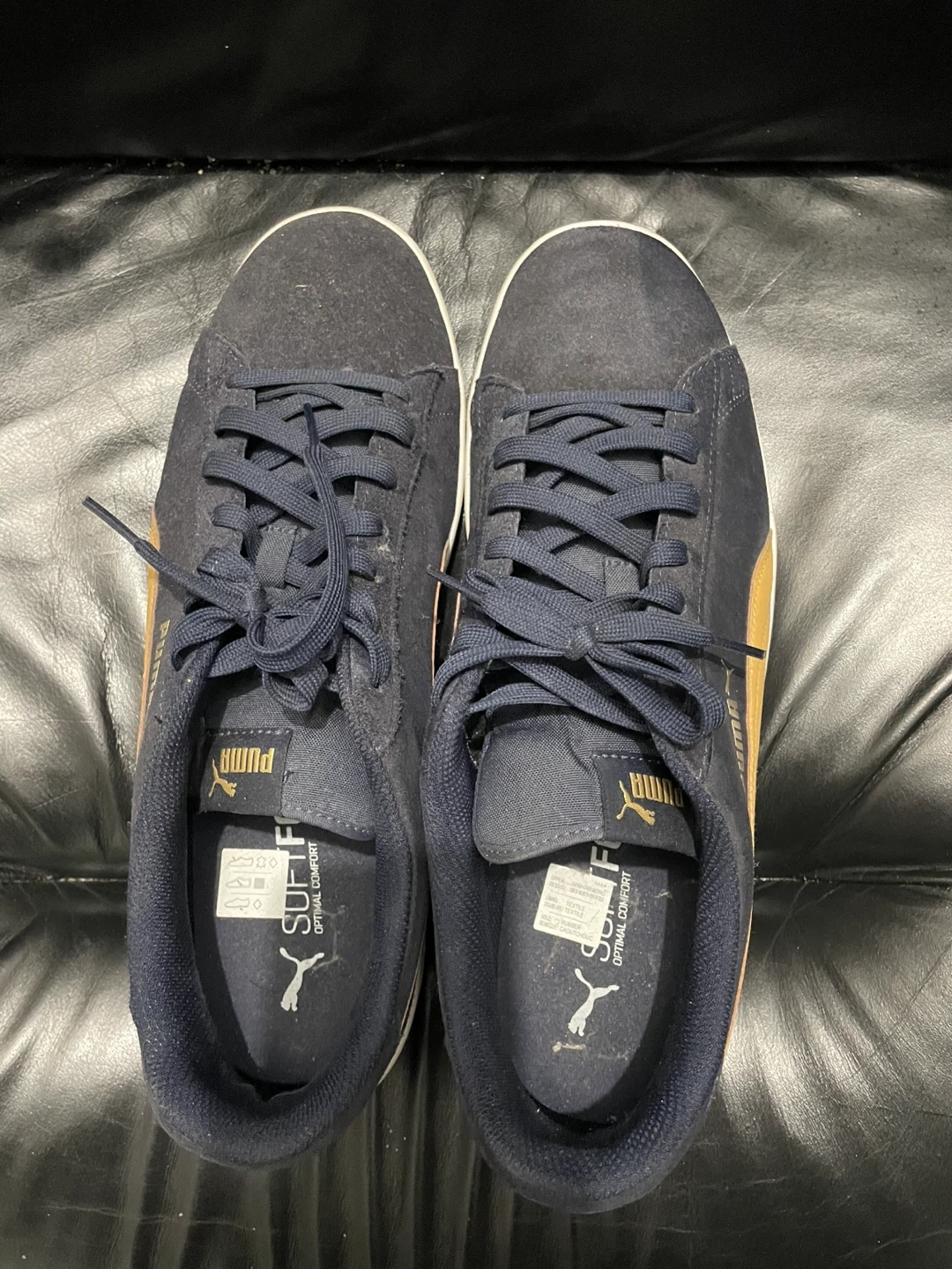 Navy blue Puma suede sneakers with gold accents. Features SoftFoam+ optimal comfort insole. US size 14, UK 13, EUR 48.5, CM 31.5.