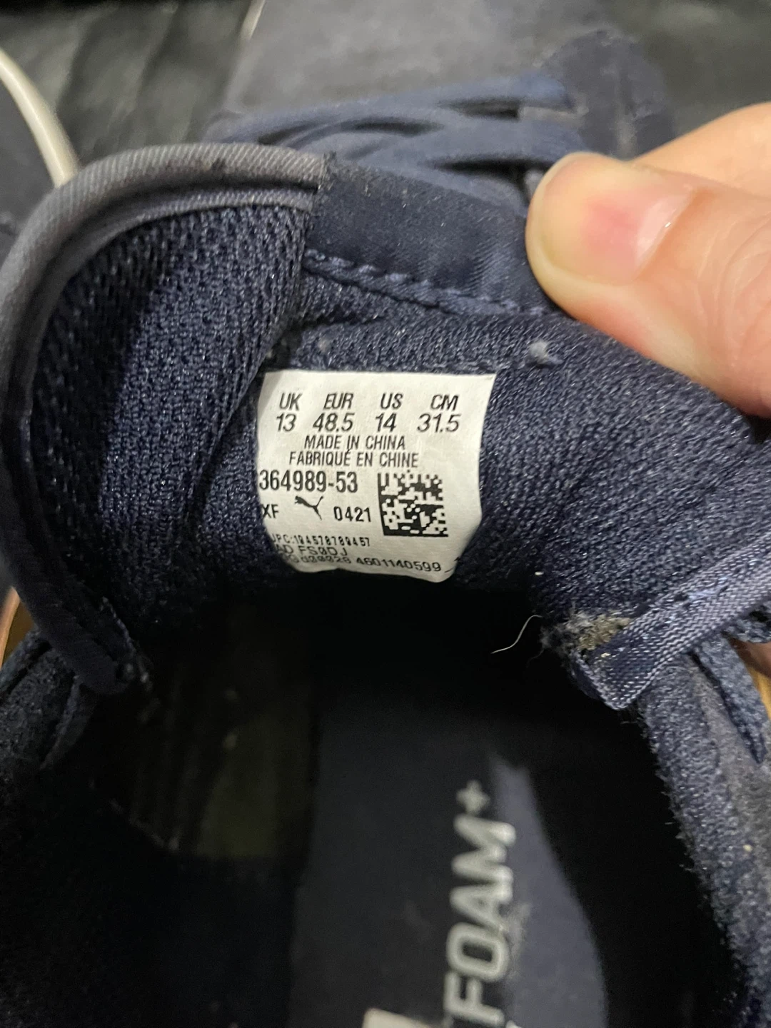 Navy blue Puma suede sneakers with gold accents. Features SoftFoam+ optimal comfort insole. US size 14, UK 13, EUR 48.5, CM 31.5.