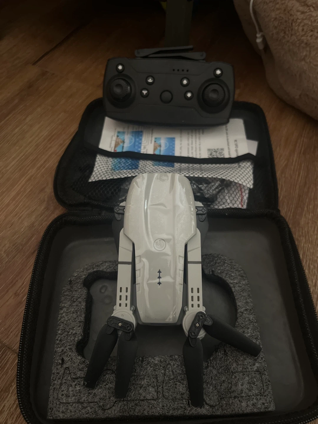 Grey foldable drone with remote control and a protective carrying case. Includes instruction manual. It's designed for easy portability. This drone is good for beginners looking to learn aerial photography.