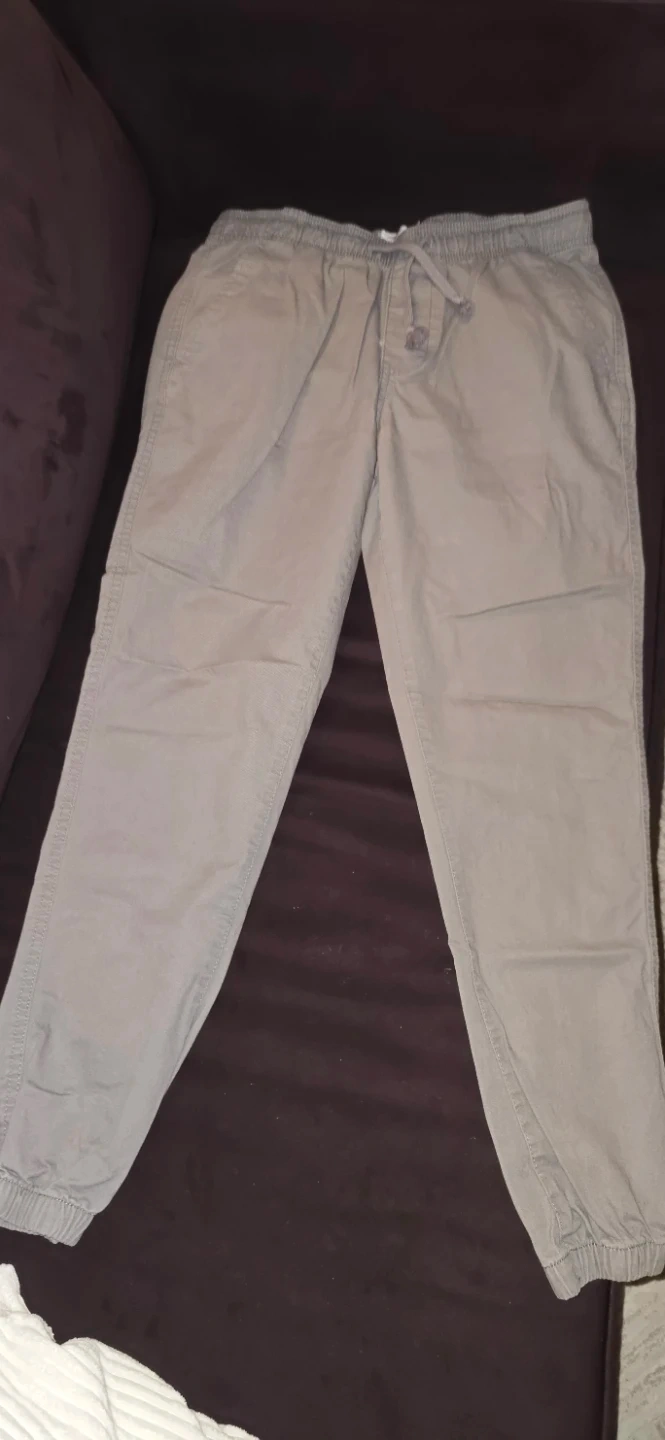Selling a pair of grey jogger pants. They're in great condition and ready for a new owner! The pants feature a comfortable elastic waistband with a drawstring. Perfect for casual wear or lounging around at home.